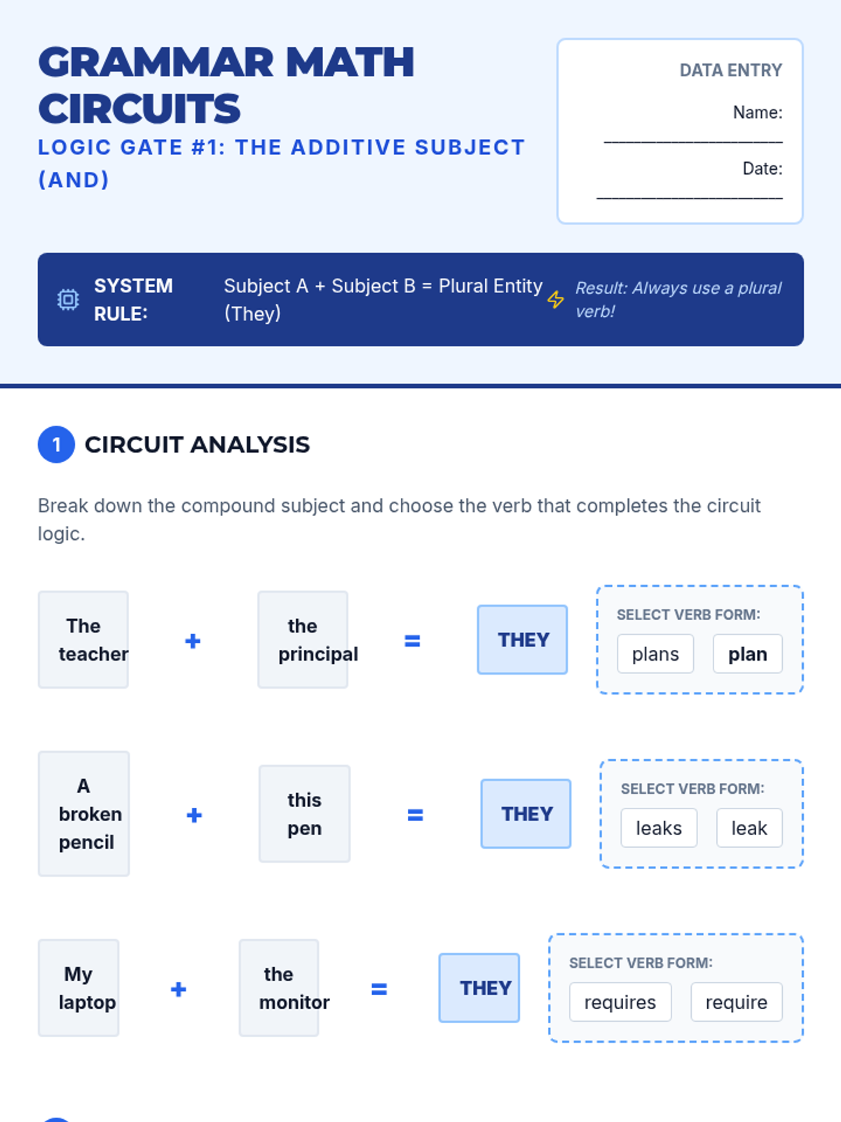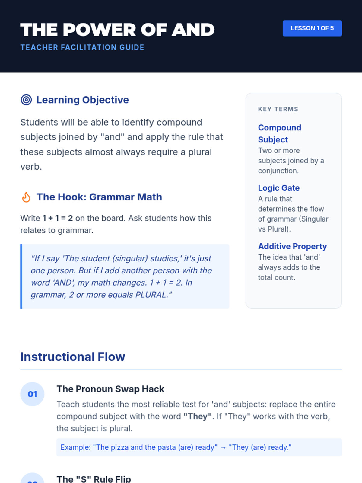 This 6th-grade ELA sequence explores the complexities of subject-verb agreement with compound subjects. Using a logical, game-based framework, students learn to distinguish between the additive nature of 'and' and the proximity rule of 'or/nor' through interactive simulations, grammar 'equations', and creative writing projects.