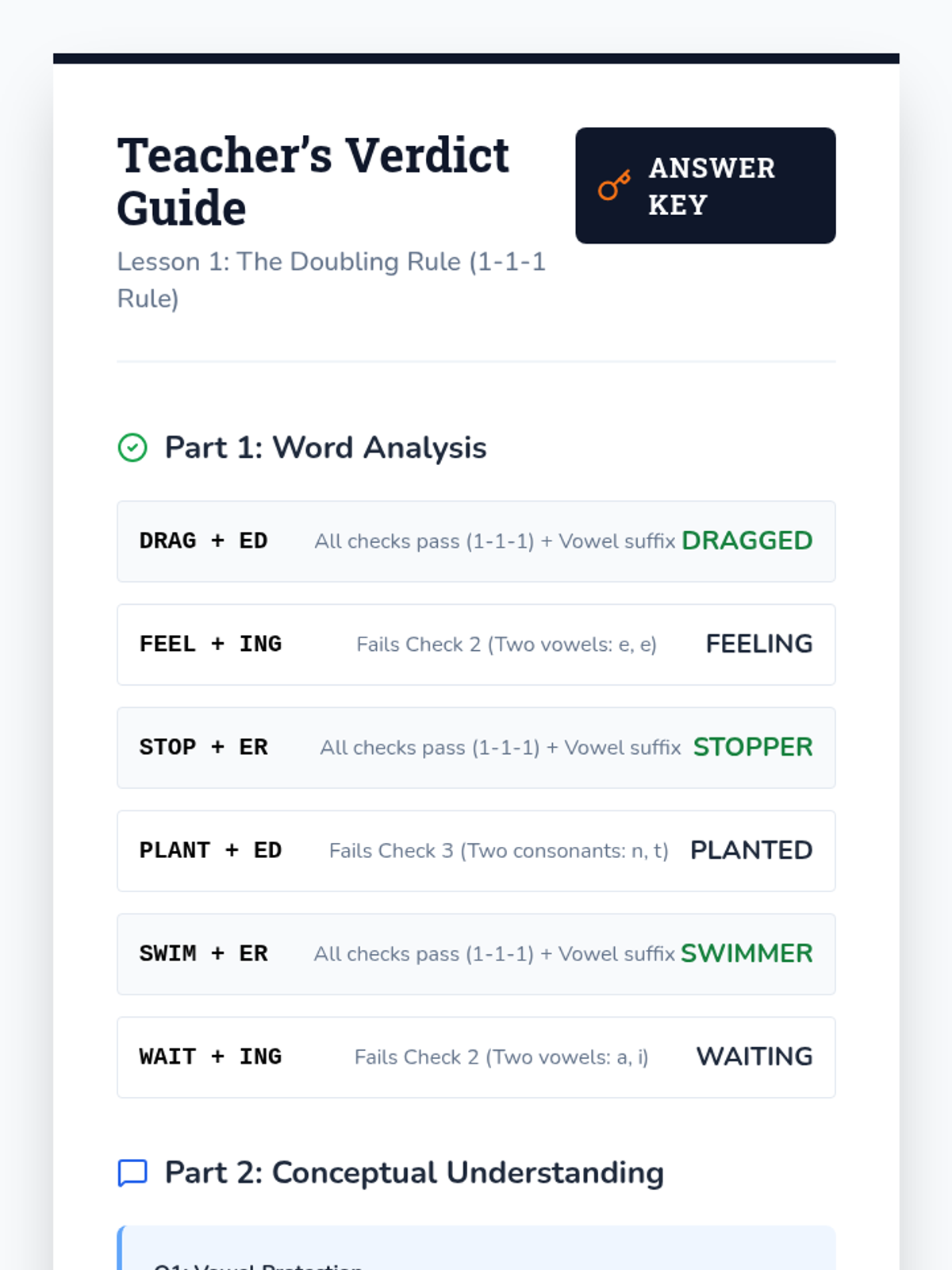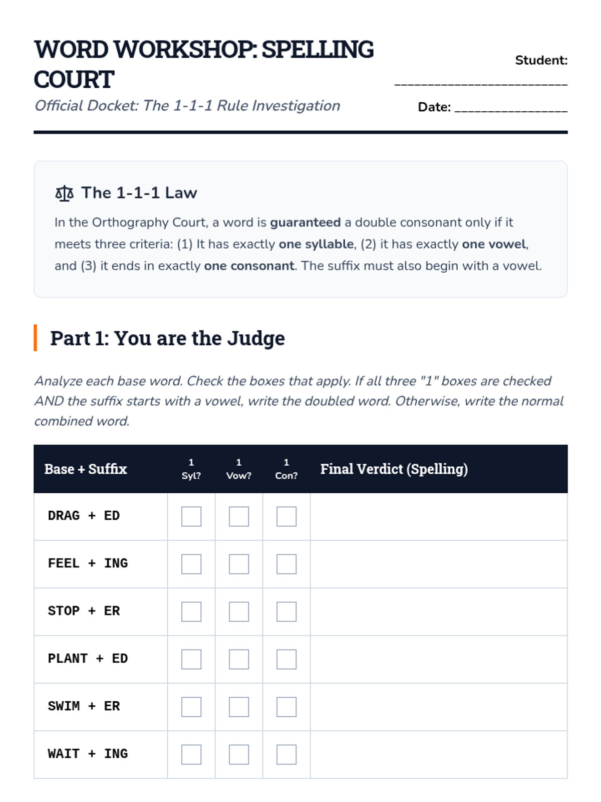 A systematic study of suffix orthography rules including the 1-1-1 rule, silent e, changing y to i, and irregular plurals. Students learn the logic behind spelling changes to preserve vowel sounds and apply these rules in a final workshop.