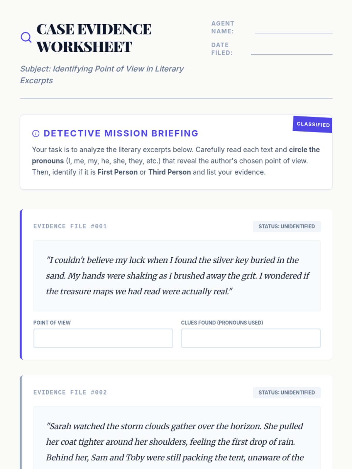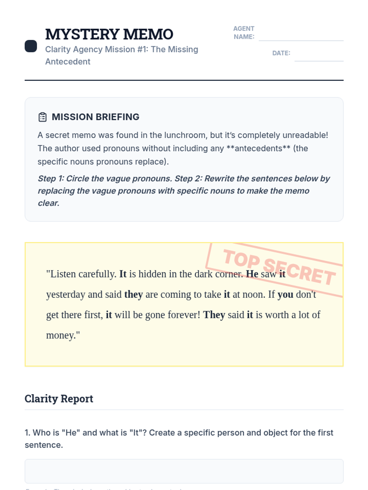 A detective-themed ELA sequence where students become 'Clarity Agents' to identify and fix vague or ambiguous pronoun references in their writing.