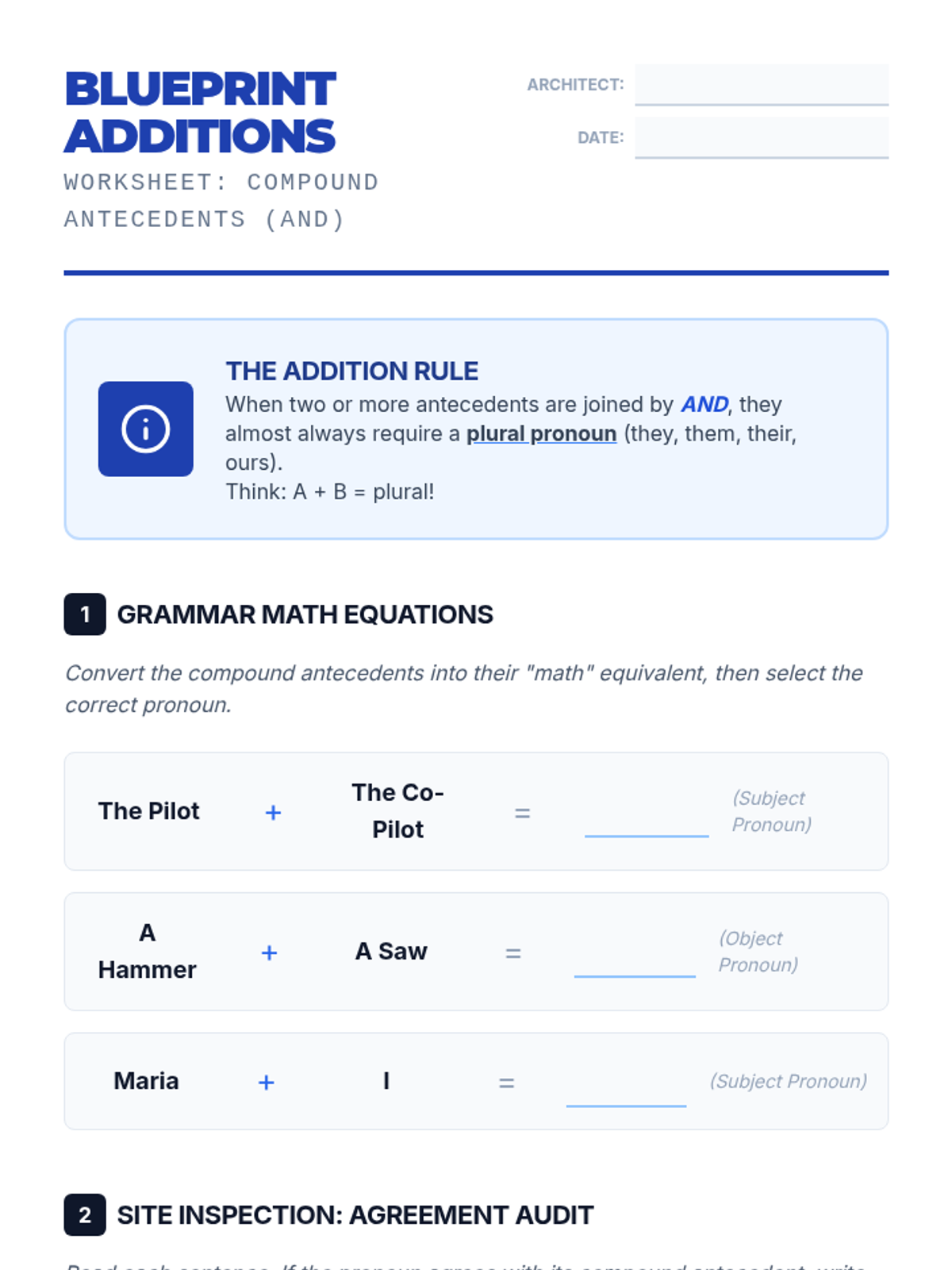 Students master the complexities of pronoun-antecedent agreement with compound subjects and collective nouns. Through an architectural lens, they learn to build stable sentences using the rules of 'And', 'Or/Nor', and the context of groups.