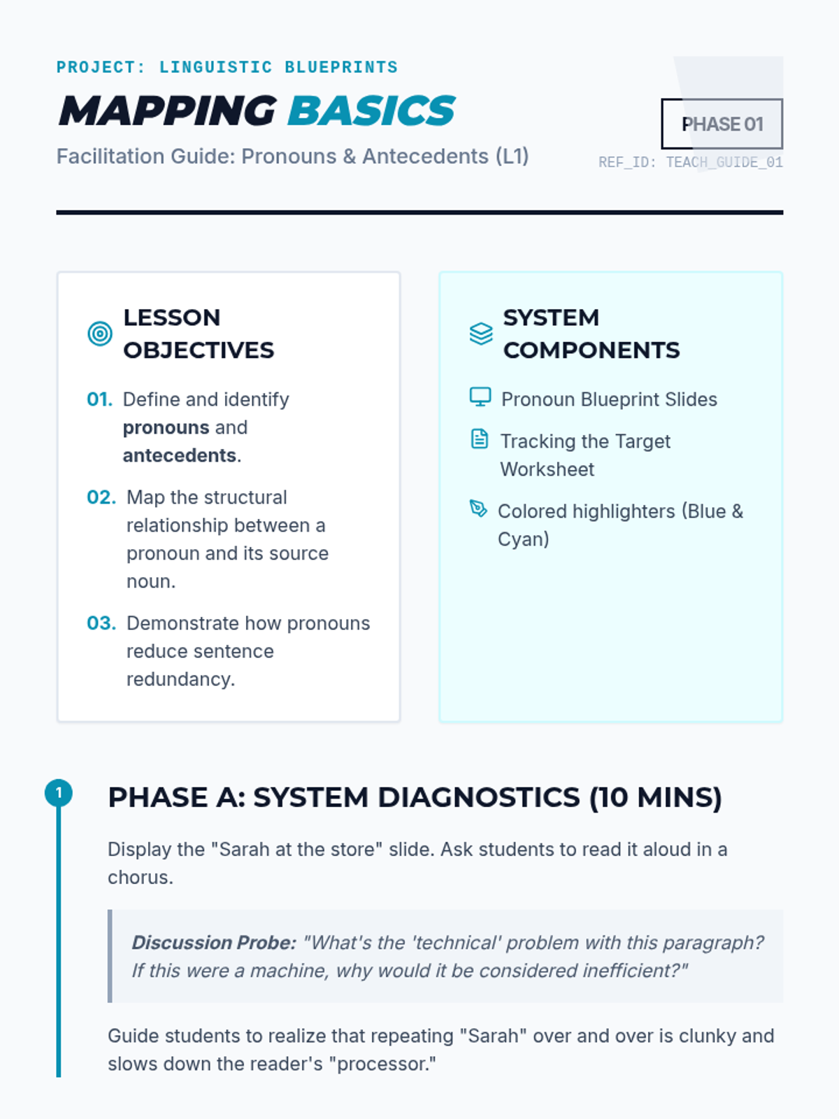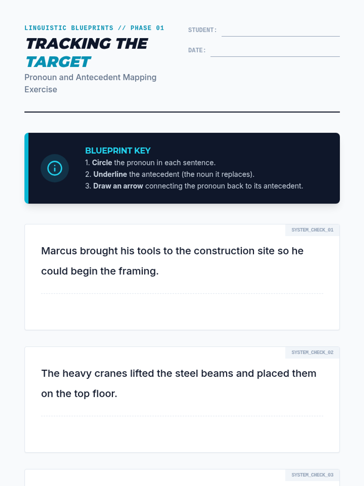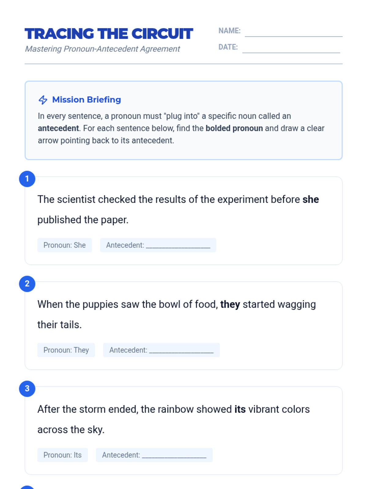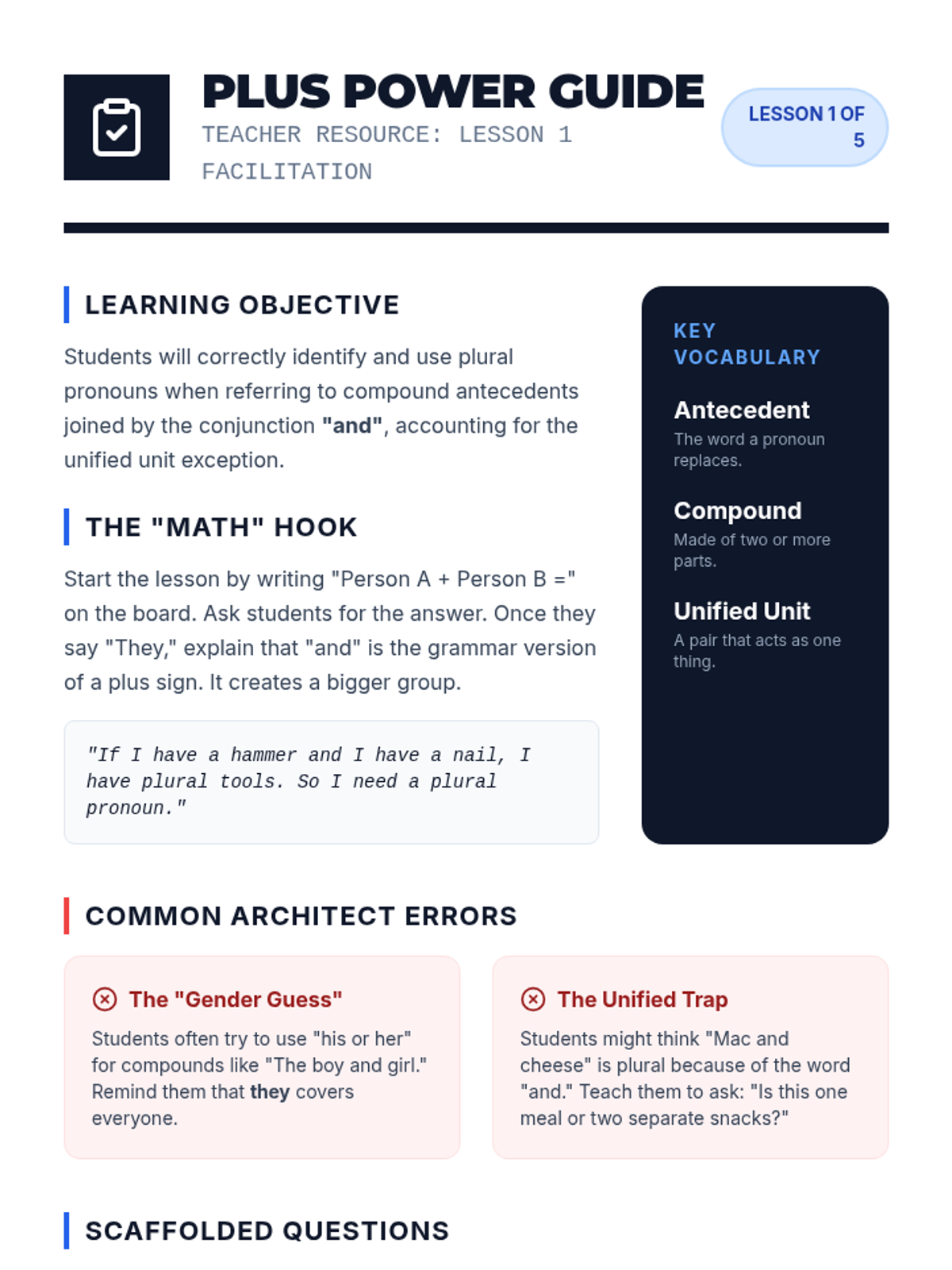 A comprehensive 5-lesson unit for 6th-grade students on pronoun-antecedent agreement. Students will learn to identify antecedents, match them by number, person, and gender, and handle complex compound subjects through a technical 'Linguistic Blueprints' theme.
