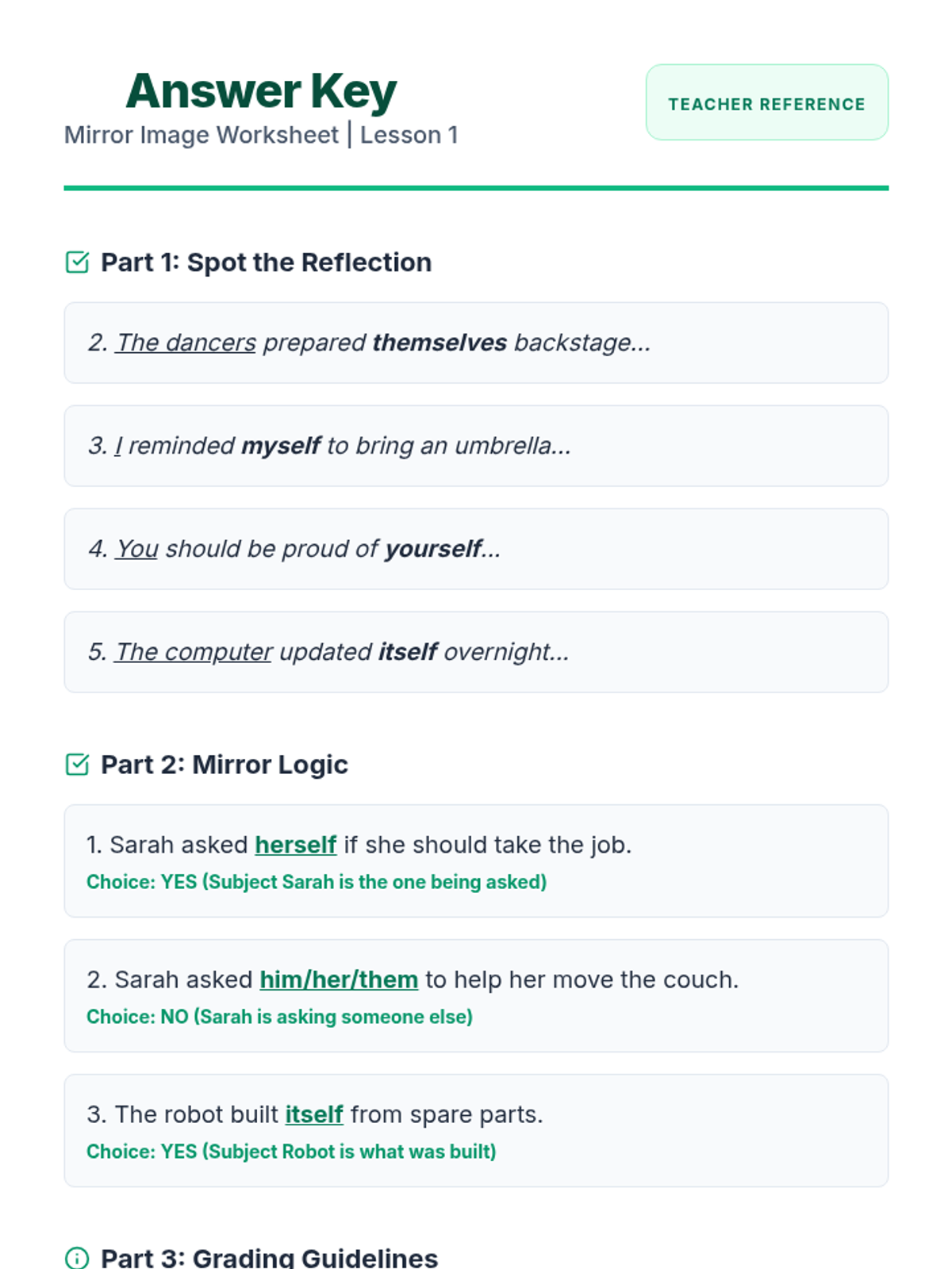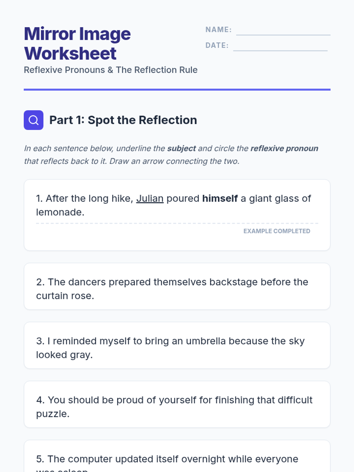 A comprehensive unit on reflexive and intensive pronouns, focusing on correct identification, usage, and correcting common hyper-correction errors. Students move from basic definitions to complex creative applications.