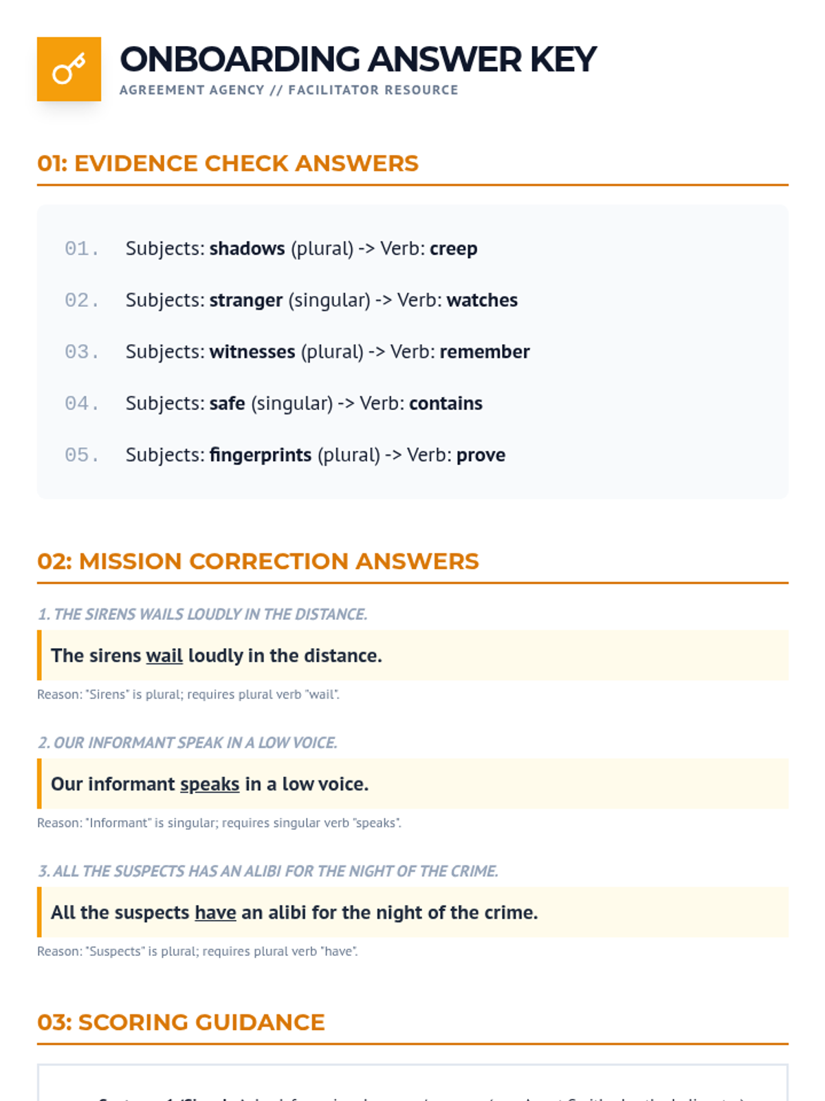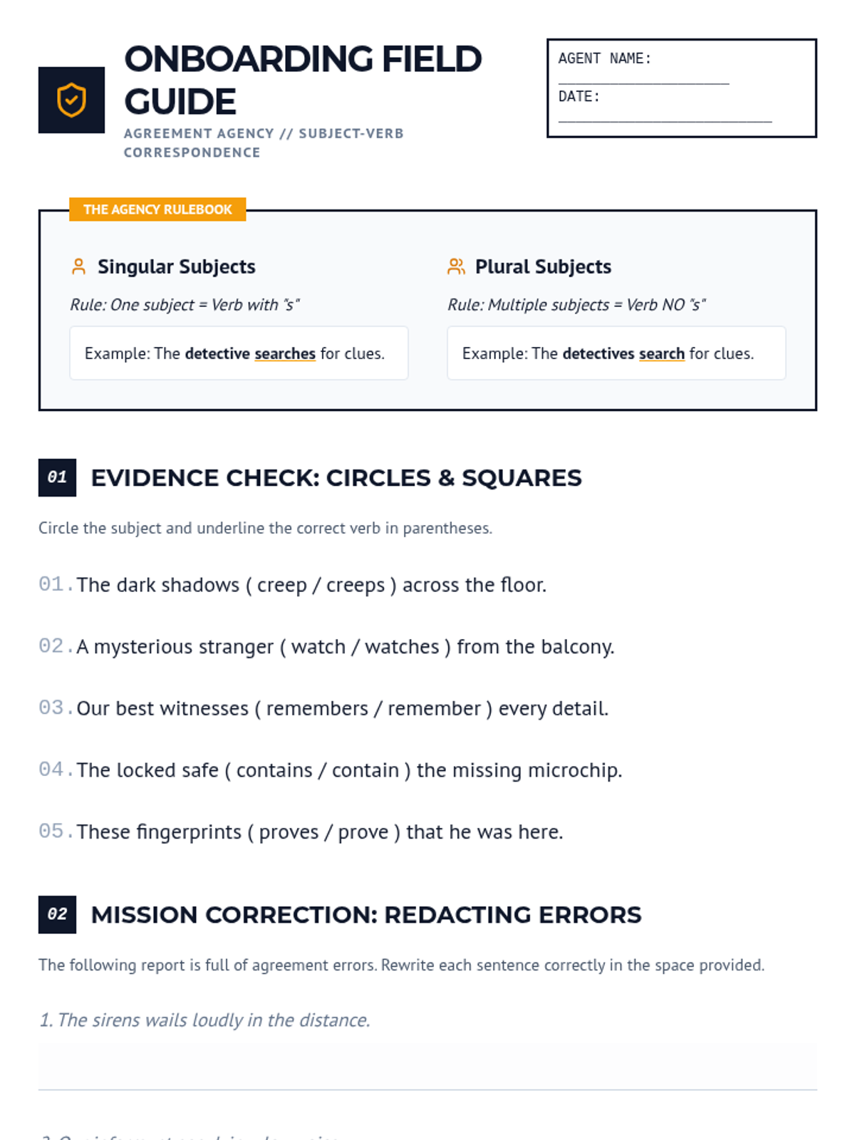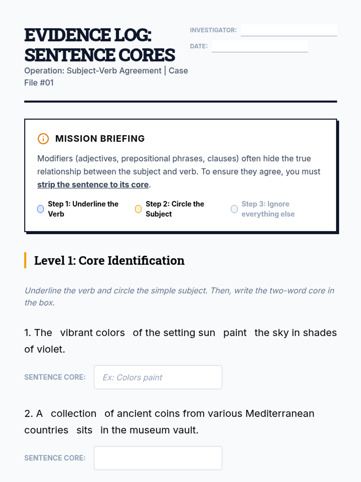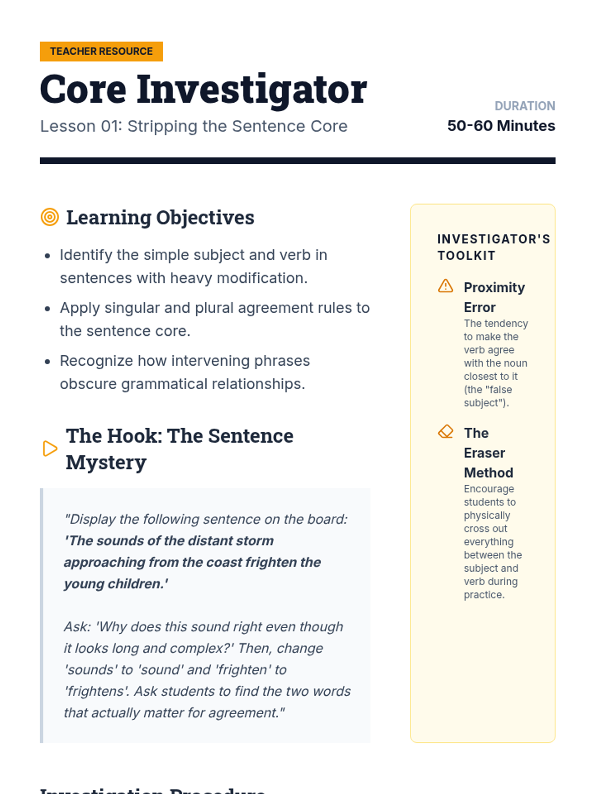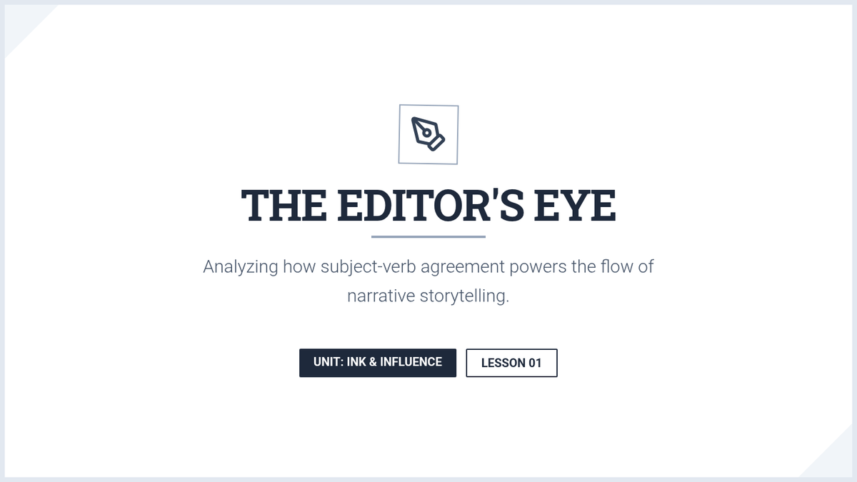 An inquiry-based grammar sequence where students act as linguistic investigators to master subject-verb agreement. Students learn to identify the sentence core, filter out prepositional phrases, handle appositives, and navigate complex modifiers like 'as well as'.