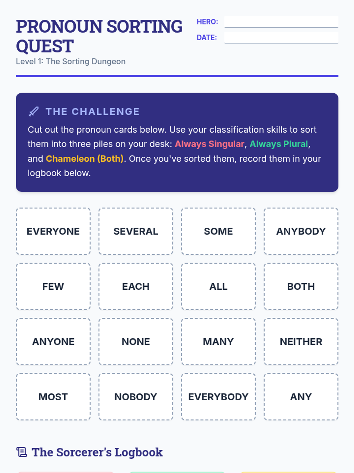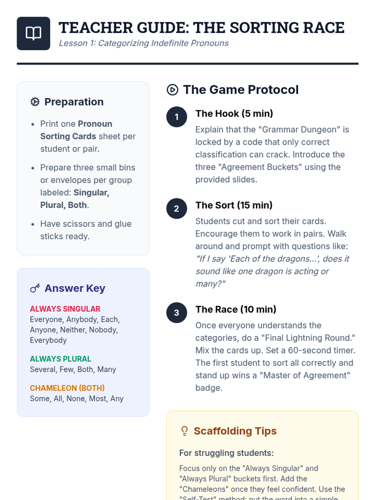 A gamified sequence designed for 6th-grade students to master indefinite pronoun agreement. Through a 'Grammar Dungeon' theme, students categorize pronouns, tackle the 'always singular' rule, analyze context-dependent pronouns, and navigate formal gender conventions.