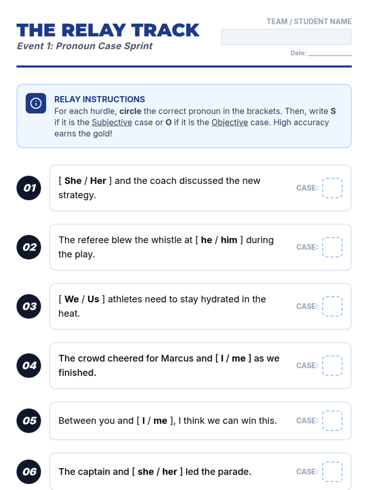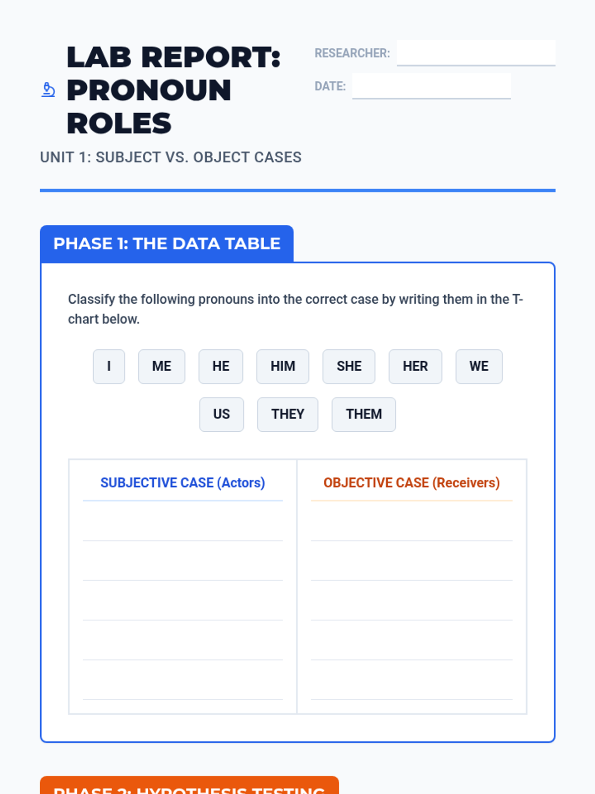 This sequence explores the distinction between subjective and objective case pronouns through the lens of a 'Grammar Lab.' Students move from basic identification to mastering compound structures and the tricky 'who vs. whom' distinction.