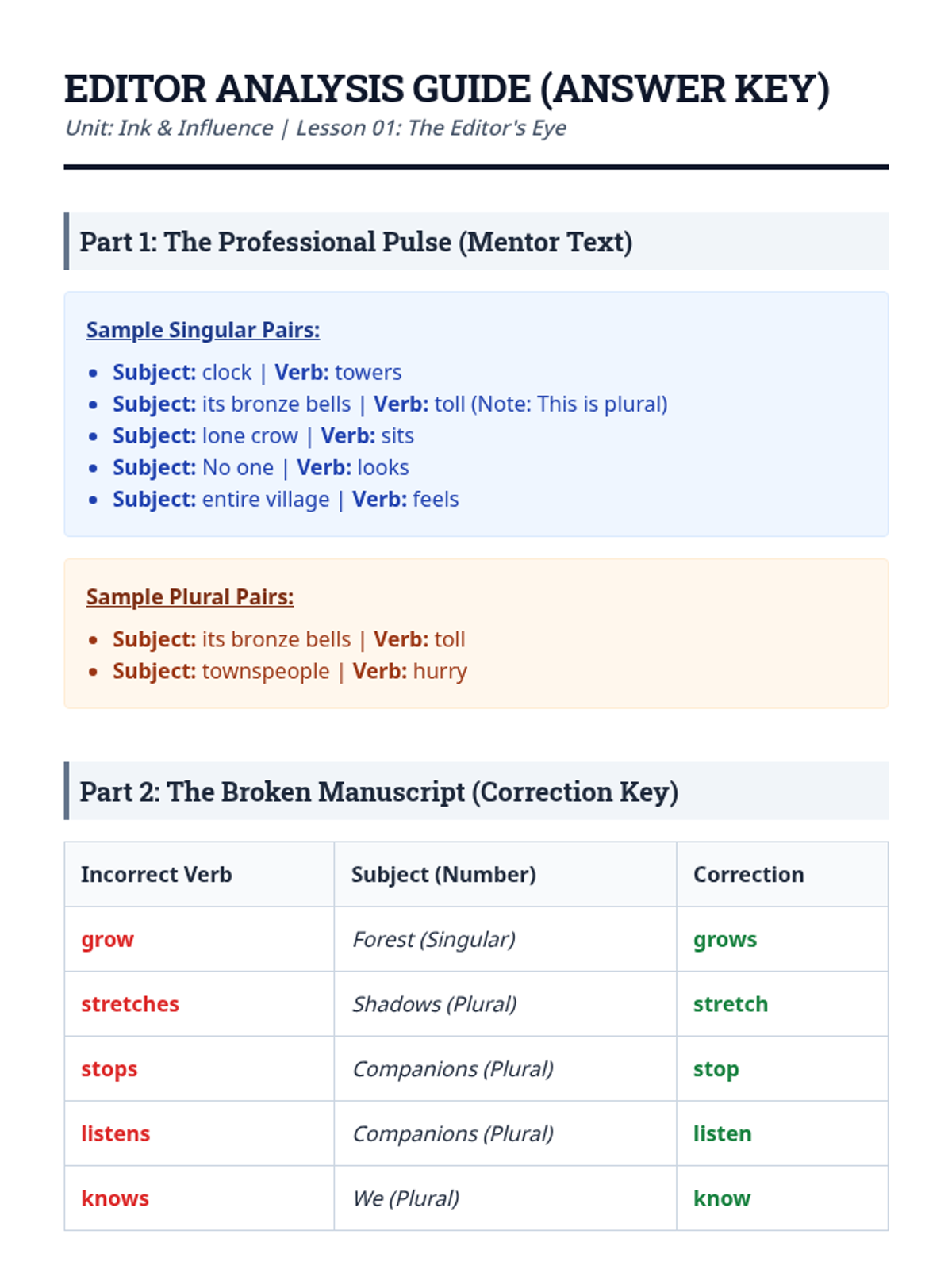 A professional simulation sequence where students act as copy editors to master subject-verb agreement in complex scenarios, including inverted sentences, existential 'there', and contractions. Students transition from isolated skill practice to full-scale text auditing and personal revision.