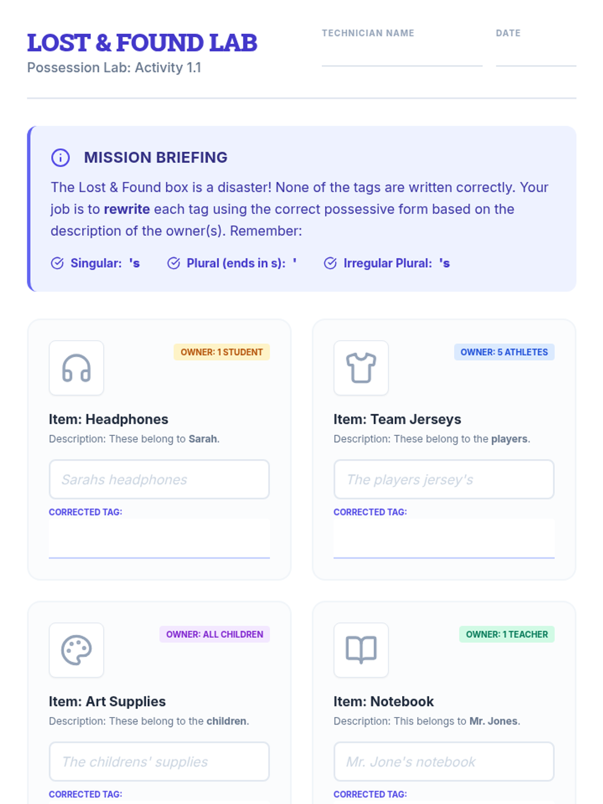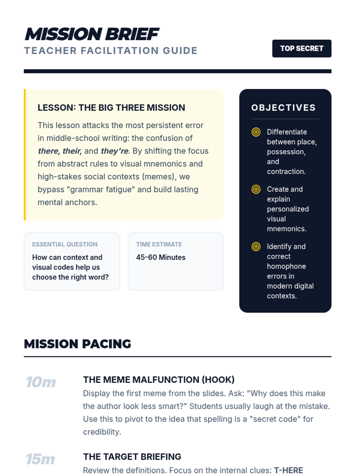 A comprehensive unit on misplaced and dangling modifiers using a 'Linguistic Detective' theme. Students progress from intuitive ear-testing to technical categorization and stylistic analysis of split infinitives, culminating in a mastery escape room challenge.