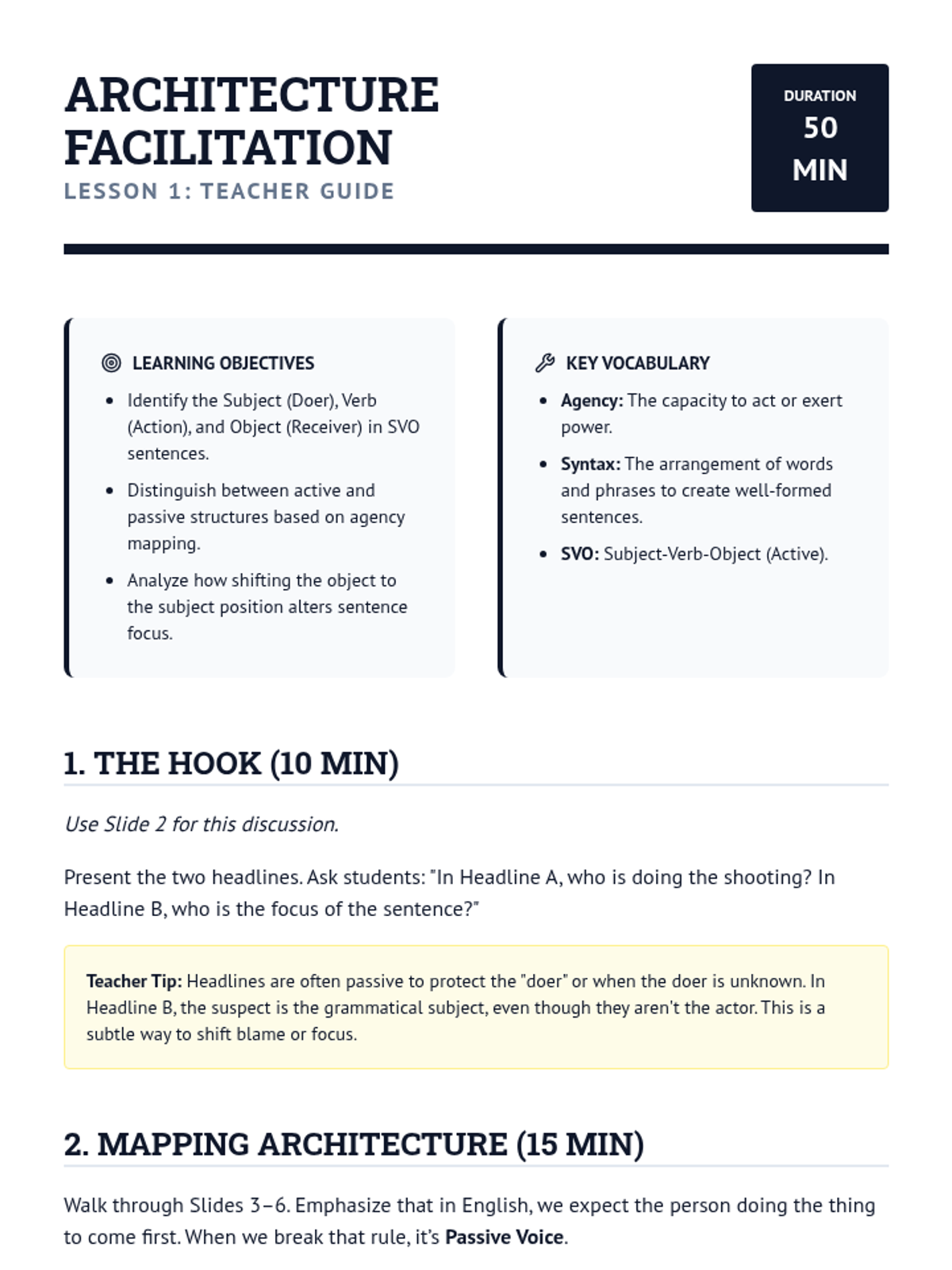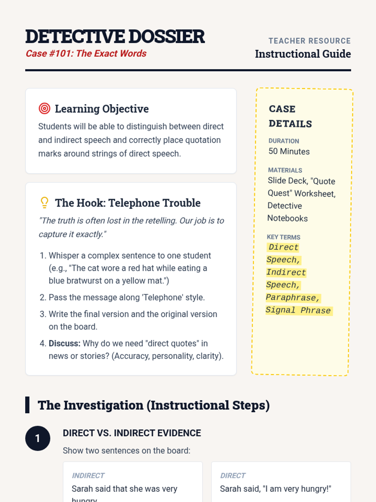 This sequence uses a linguistic detective theme to help 6th-grade students master active voice. Through inquiry-driven games like the 'Zombie Test' and real-world news simulations, students learn to identify, convert, and strategically use active voice for clearer, more direct writing.
