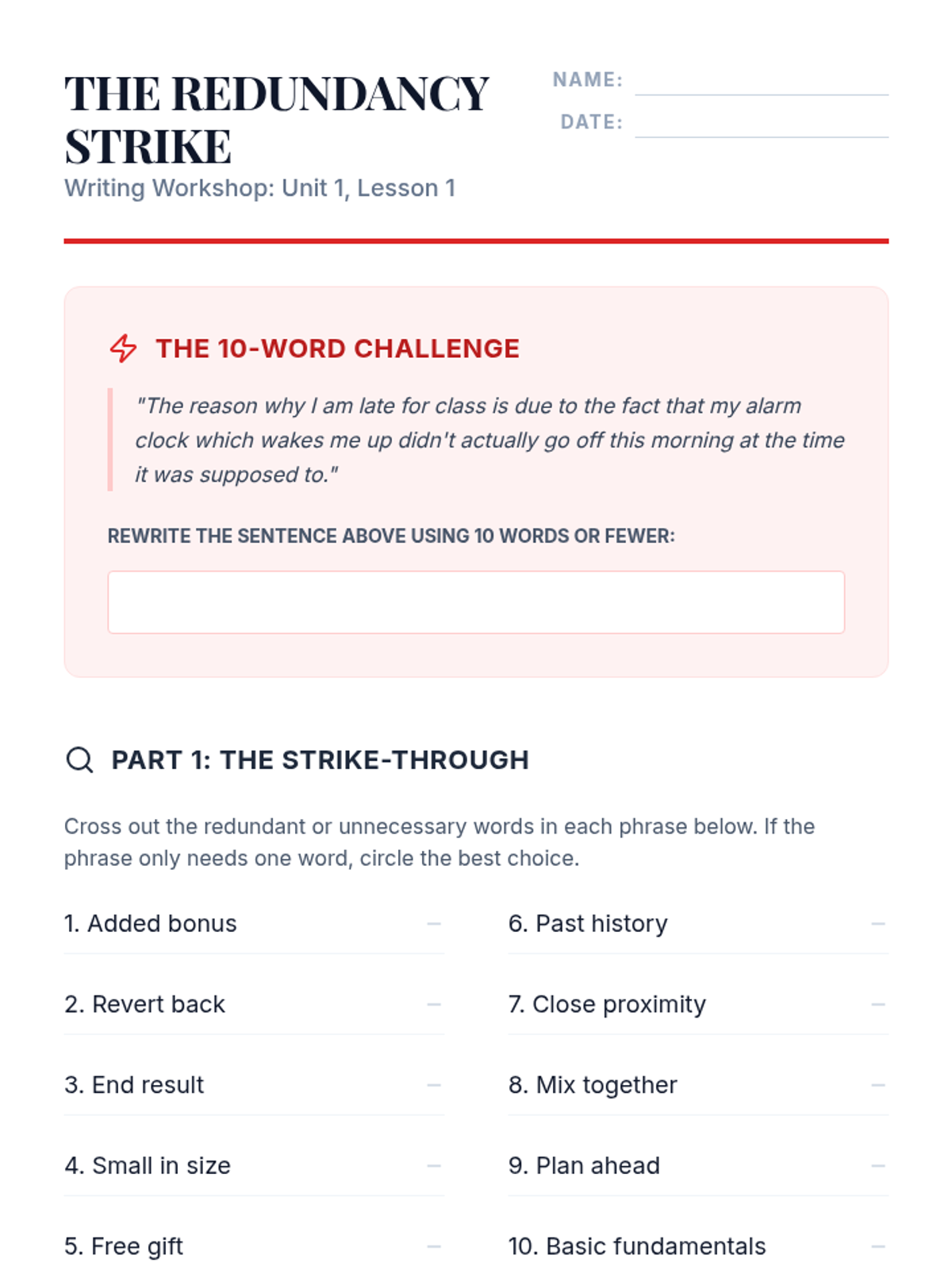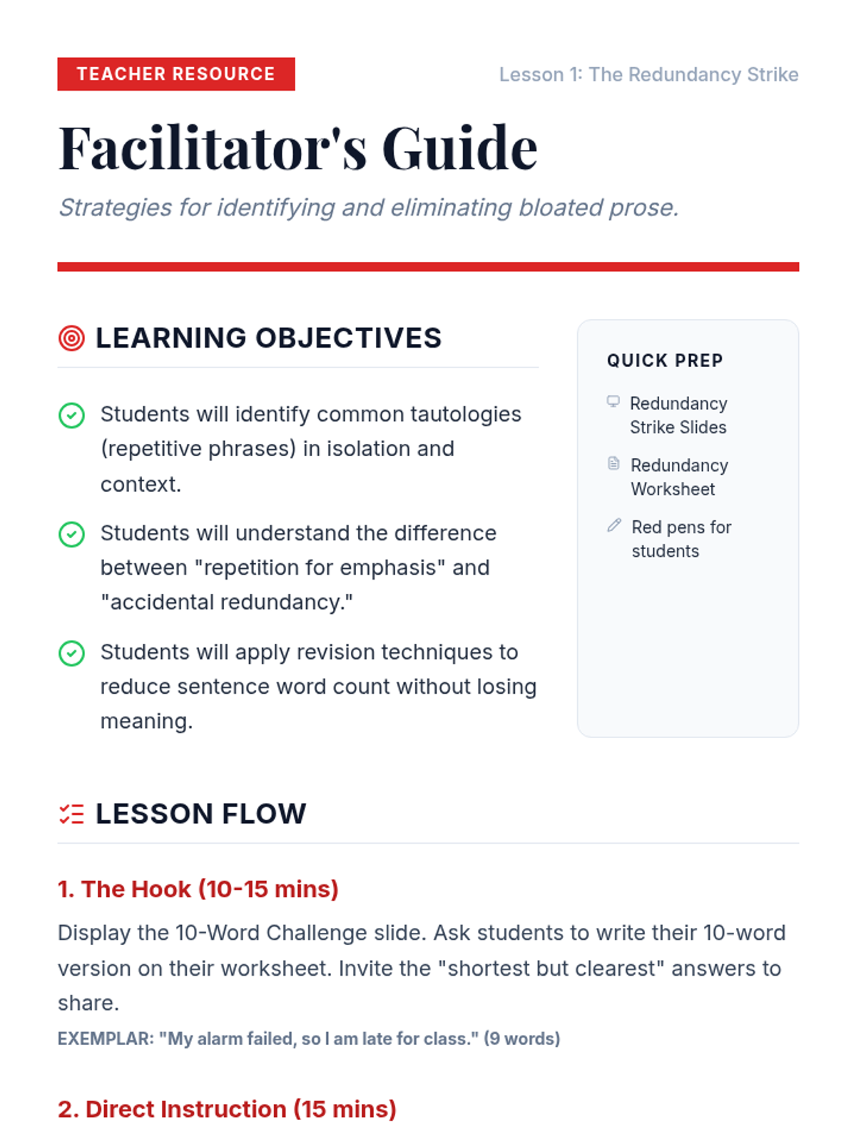 This sequence focuses on the foundational skills of word economy and vocabulary selection, teaching students to identify redundancies and replace vague language with precise alternatives. Learners will progress from sentence-level edits to full-text revision, transforming bloated prose into sharp, impactful writing.