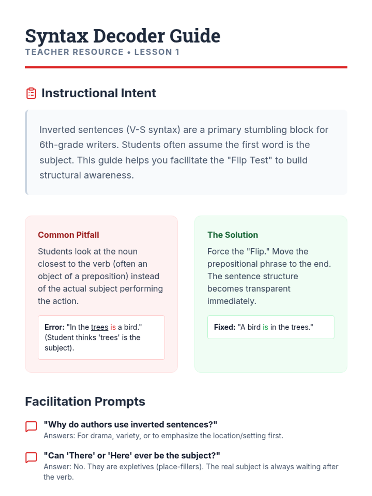A comprehensive sequence for 5th-grade students focusing on subject-verb agreement in complex and inverted sentence structures. Students learn to navigate 'Here/There' starters, questions, and poetic word orders using the 'un-inverting' revision strategy.