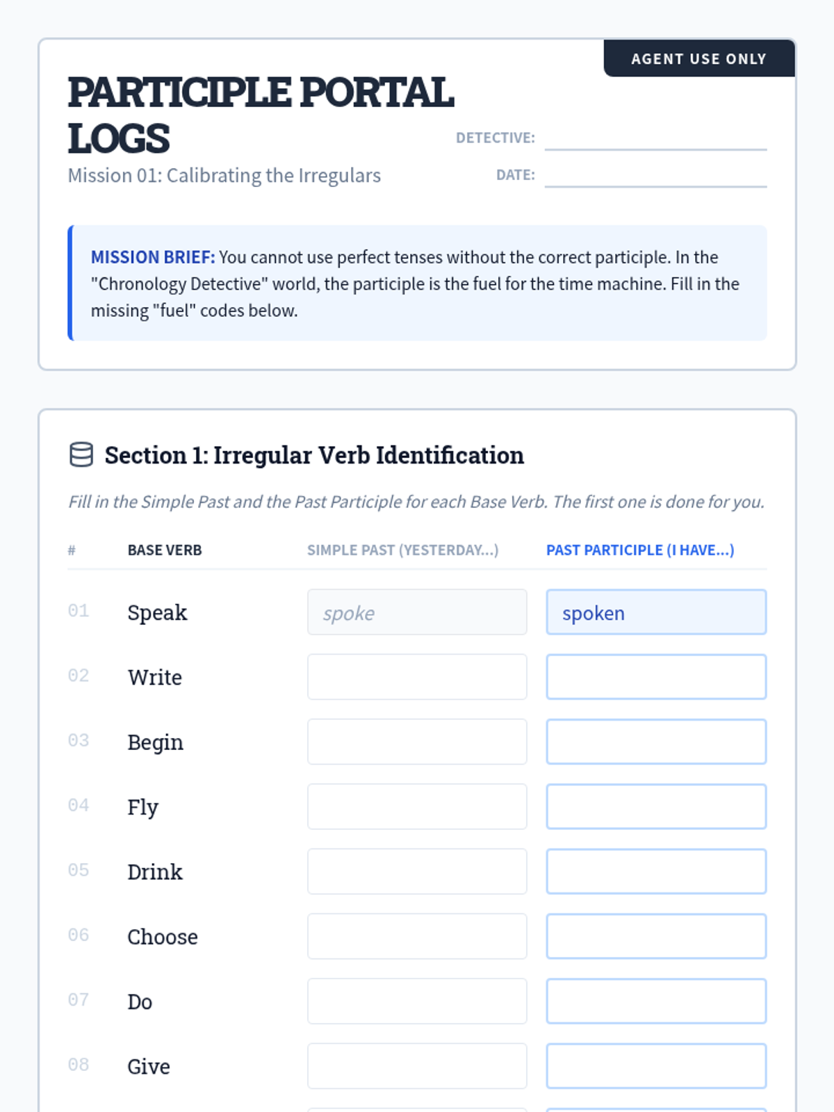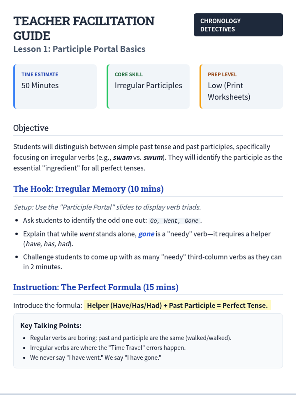 Students move from rote memorization of participles to deep analysis of timelines, understanding how perfect tenses link two points in time. The sequence uses logic puzzles and timeline mapping to demystify why and when to use 'have,' 'had,' and 'will have.'