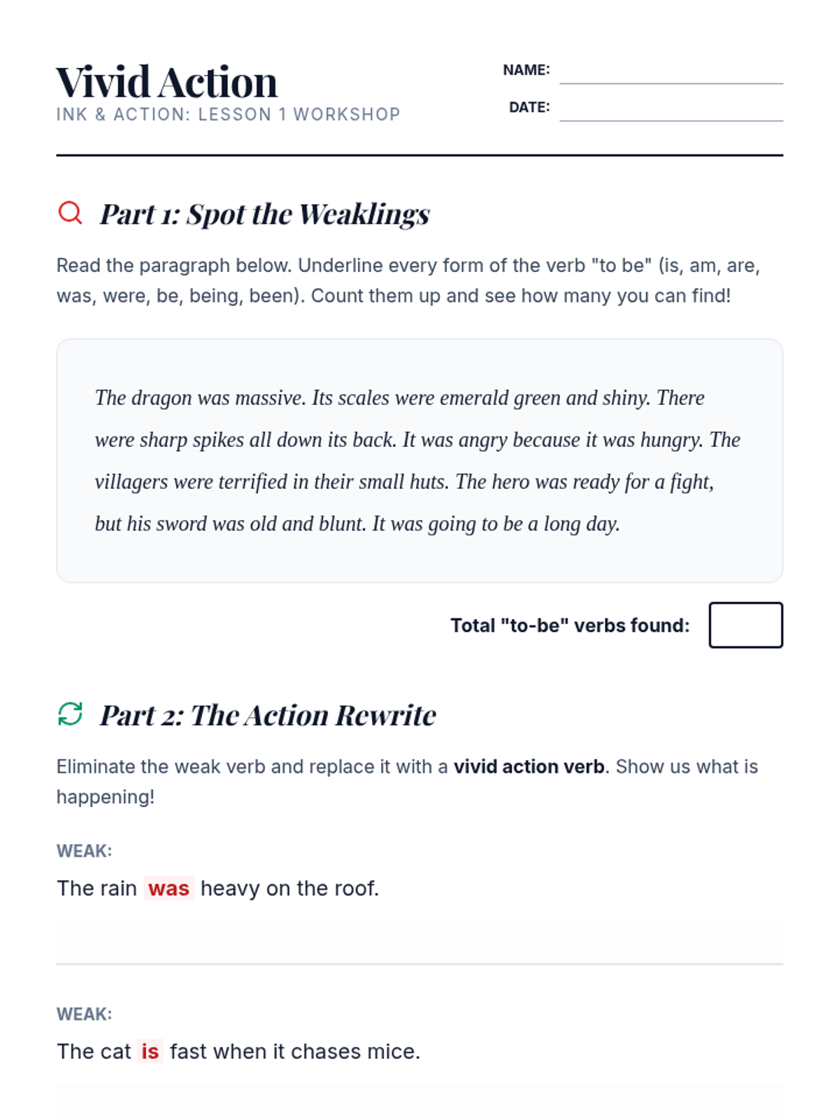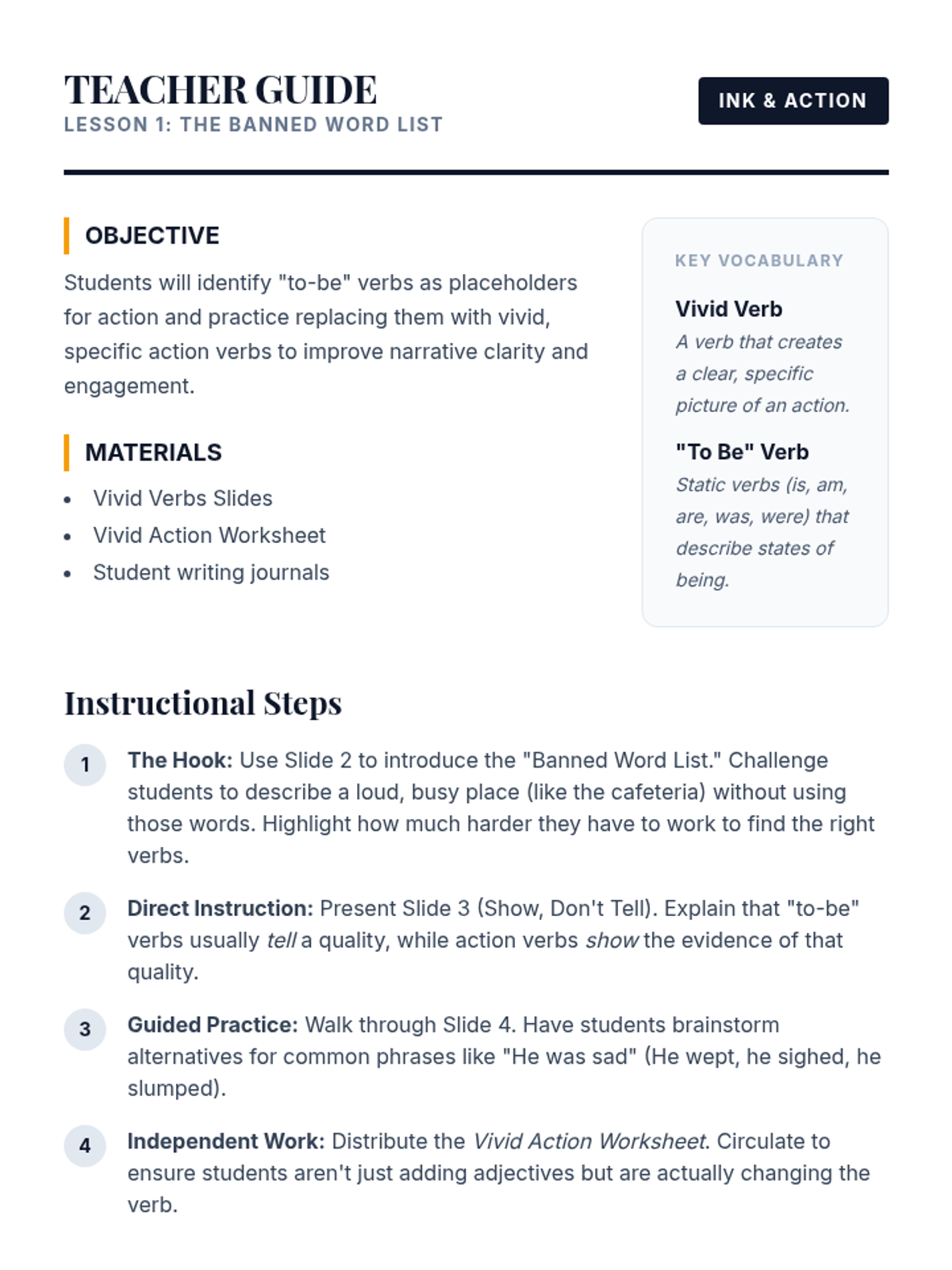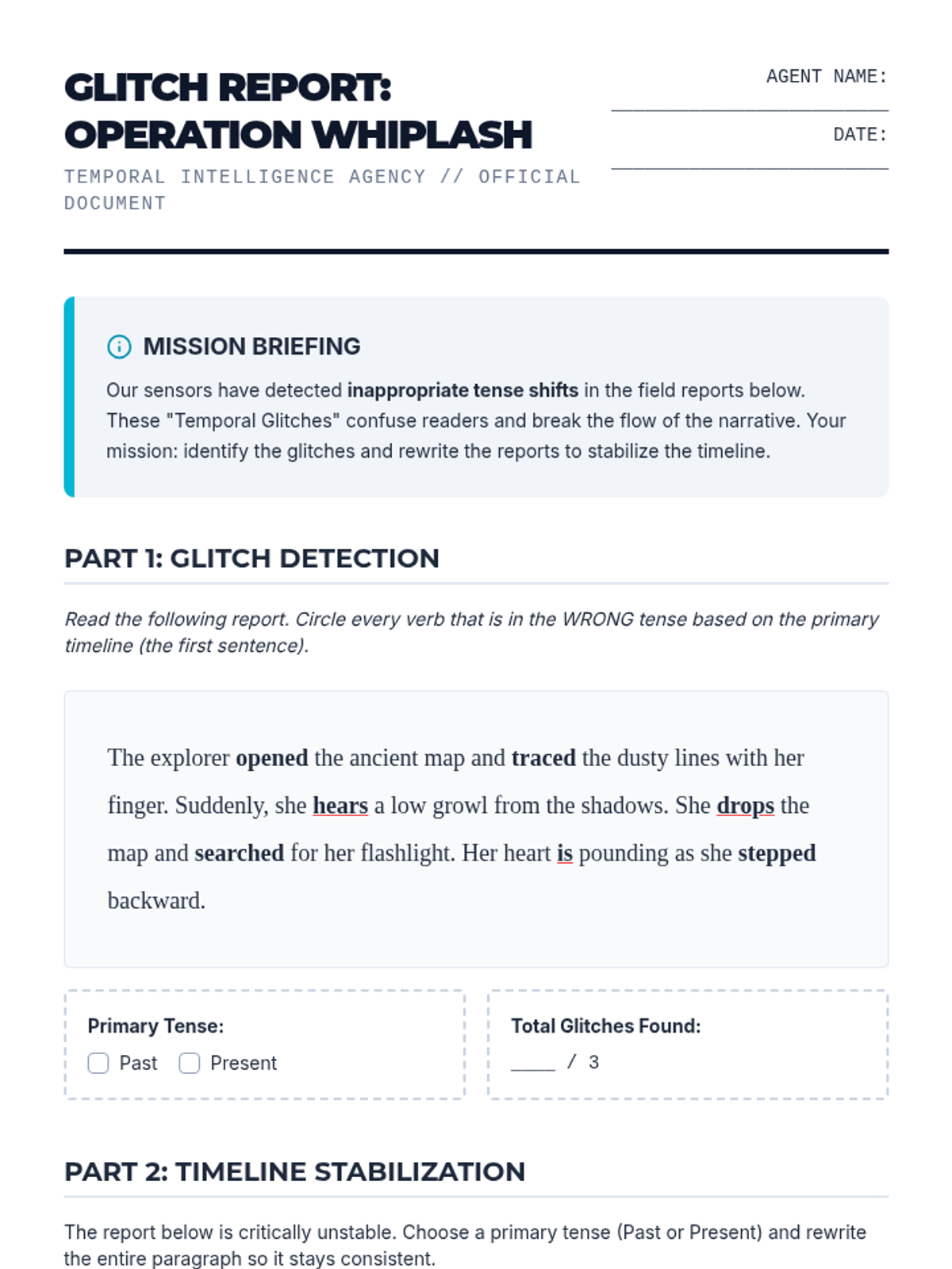 This project-based sequence applies verb knowledge to creative writing. Students focus on the stylistic impact of verbs, practicing how to shift tenses correctly within a narrative and how to replace weak 'to be' verbs with vivid action. The sequence culminates in a polished narrative piece that demonstrates mastery of tense consistency and strong verb choice.