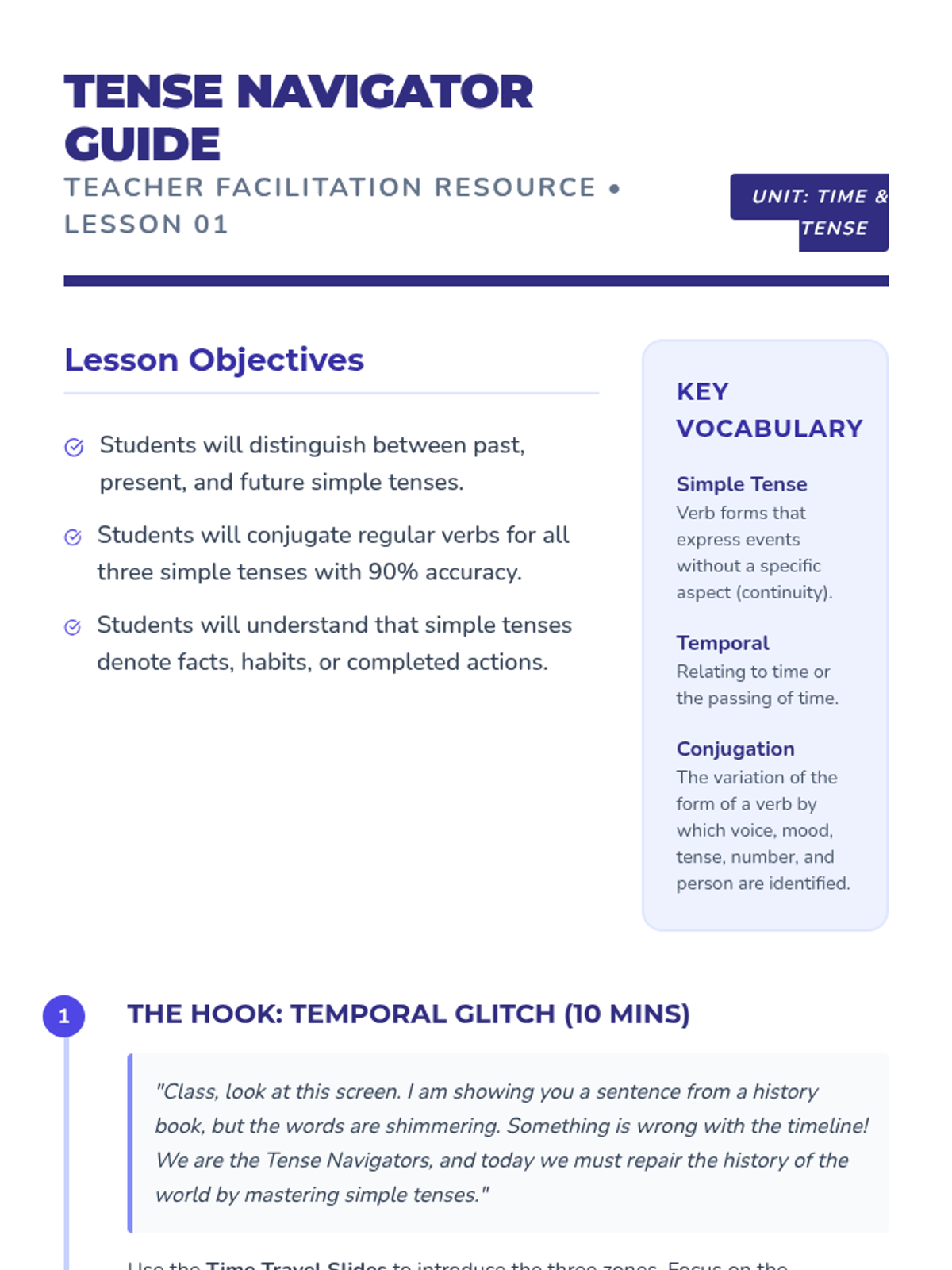 This sequence guides 6th-grade students through the mechanics of simple and progressive verb tenses. Students move from basic conjugation to nuanced usage through simulations, investigative timelines, and a final news broadcast project.