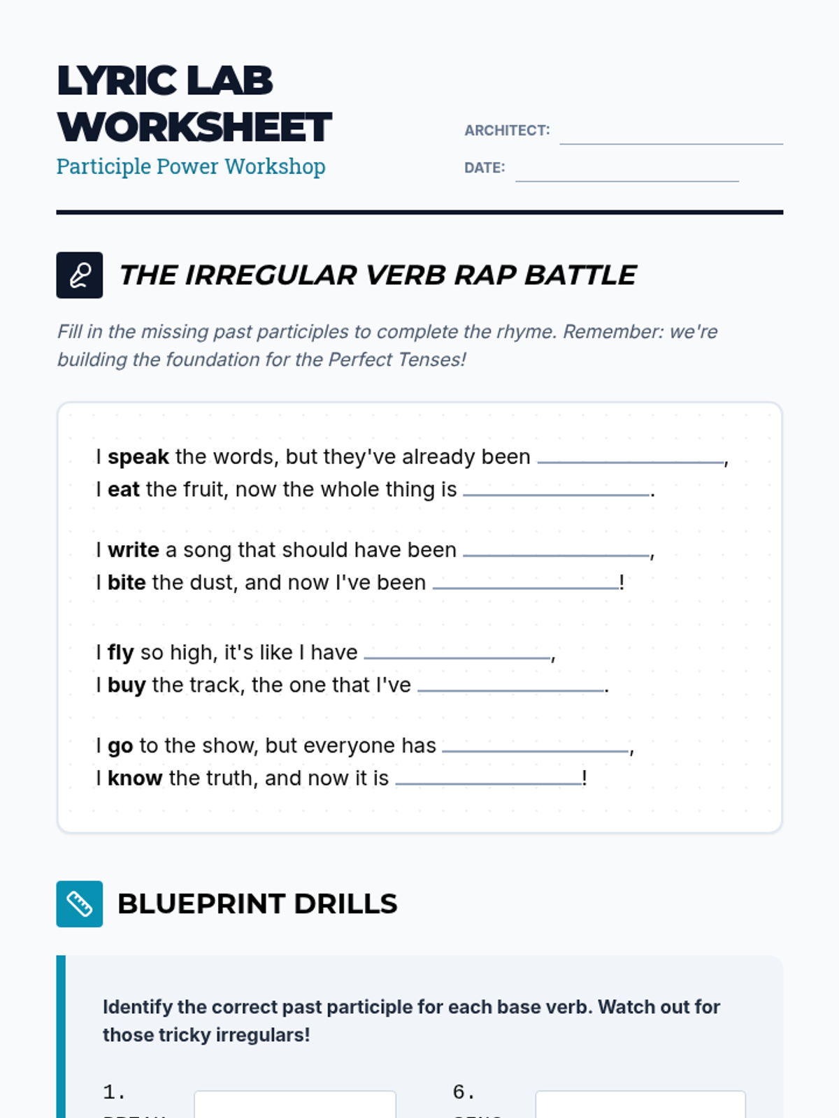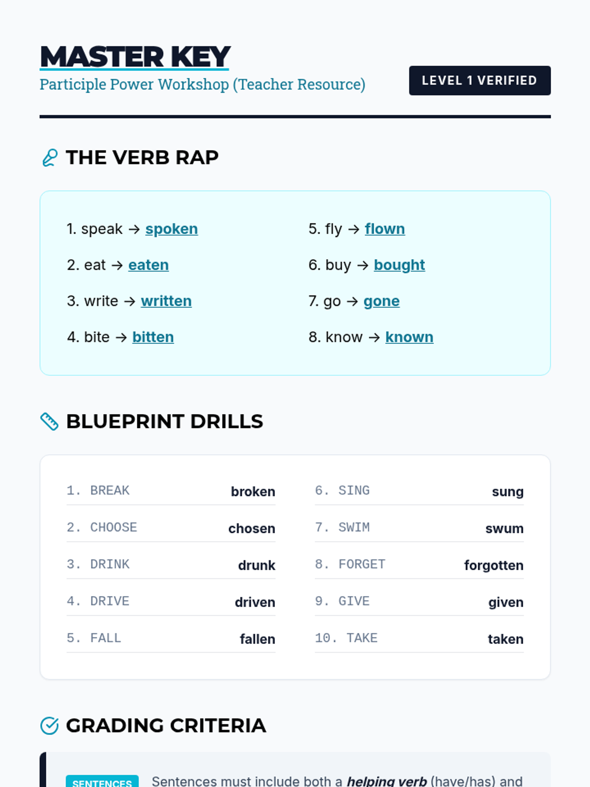 A comprehensive 6th-grade sequence on perfect verb tenses. Students progress from mastering irregular past participles to using present, past, and future perfect tenses to describe complex timelines in their own lives.