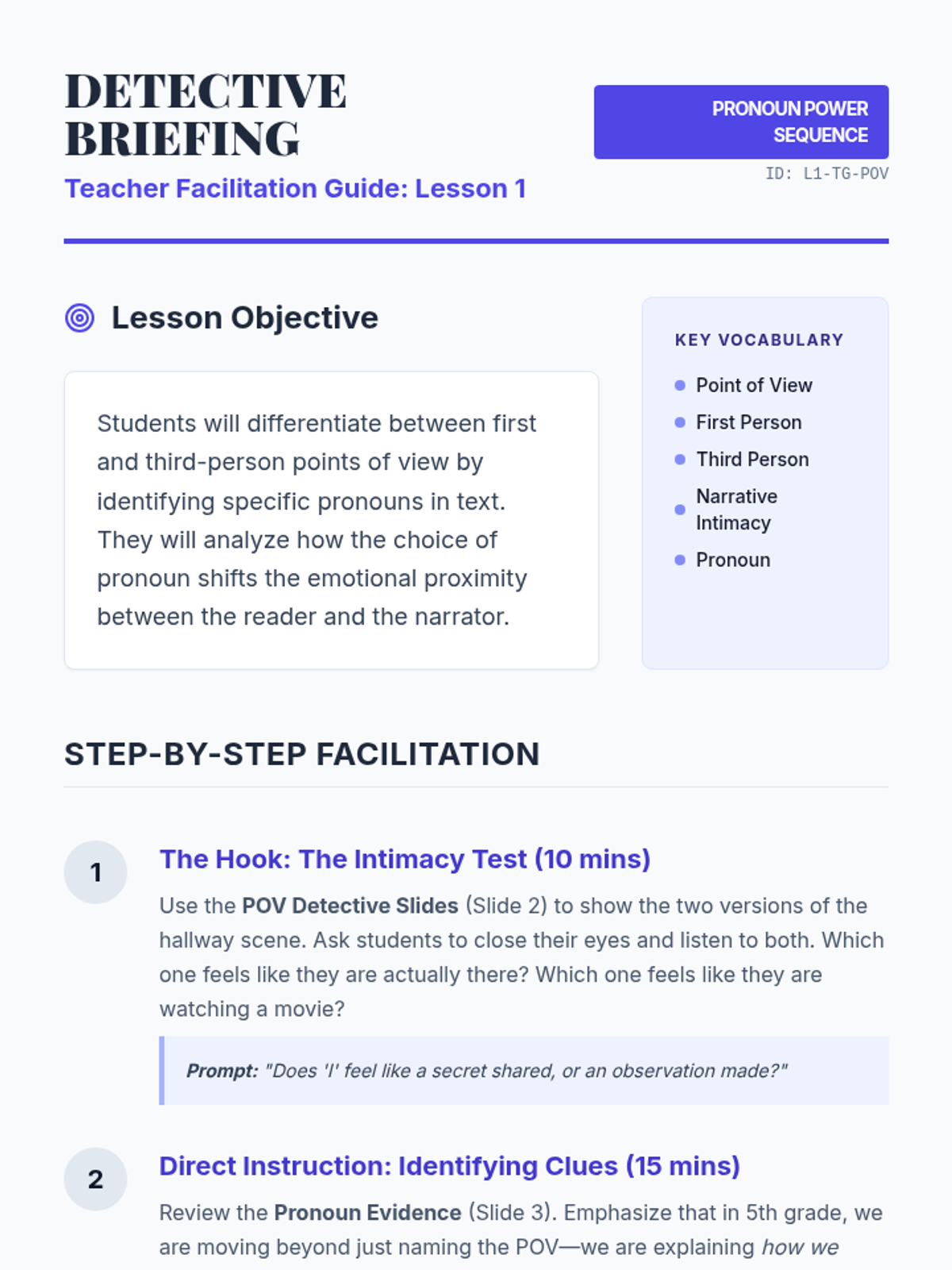 A creative writing and grammar sequence that explores how the choice of pronouns (1st vs. 3rd person) and specific pronoun types (intensive) influence narrative voice, intimacy, and reliability in storytelling. Students learn to maintain consistency and use pronouns as stylistic tools.