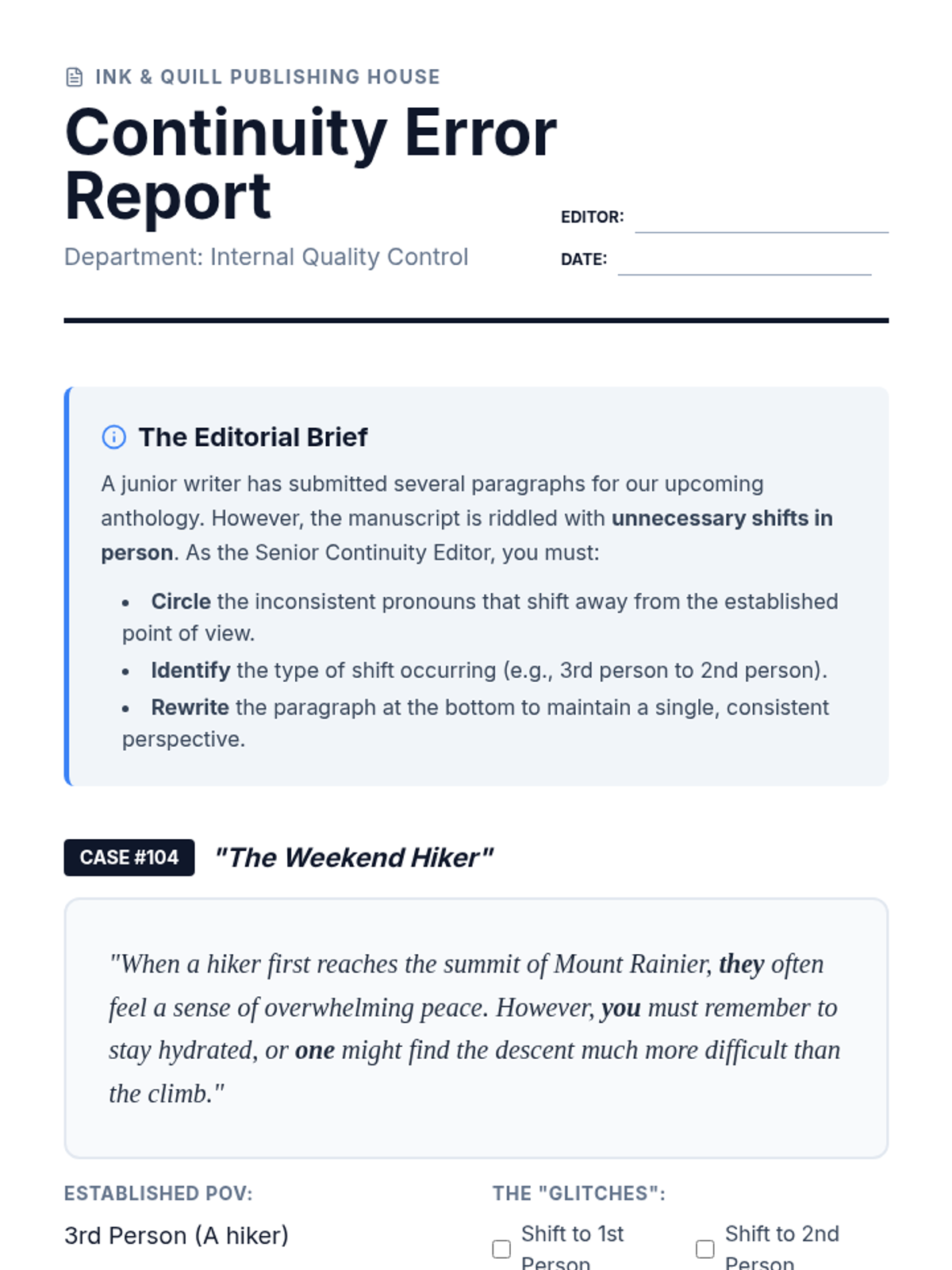 A middle school grammar sequence where students act as professional editors at a publishing house to master pronoun consistency. They explore shifts in person, formal vs. informal registers, and the evolution of the singular 'they' through simulations and project-based learning.
