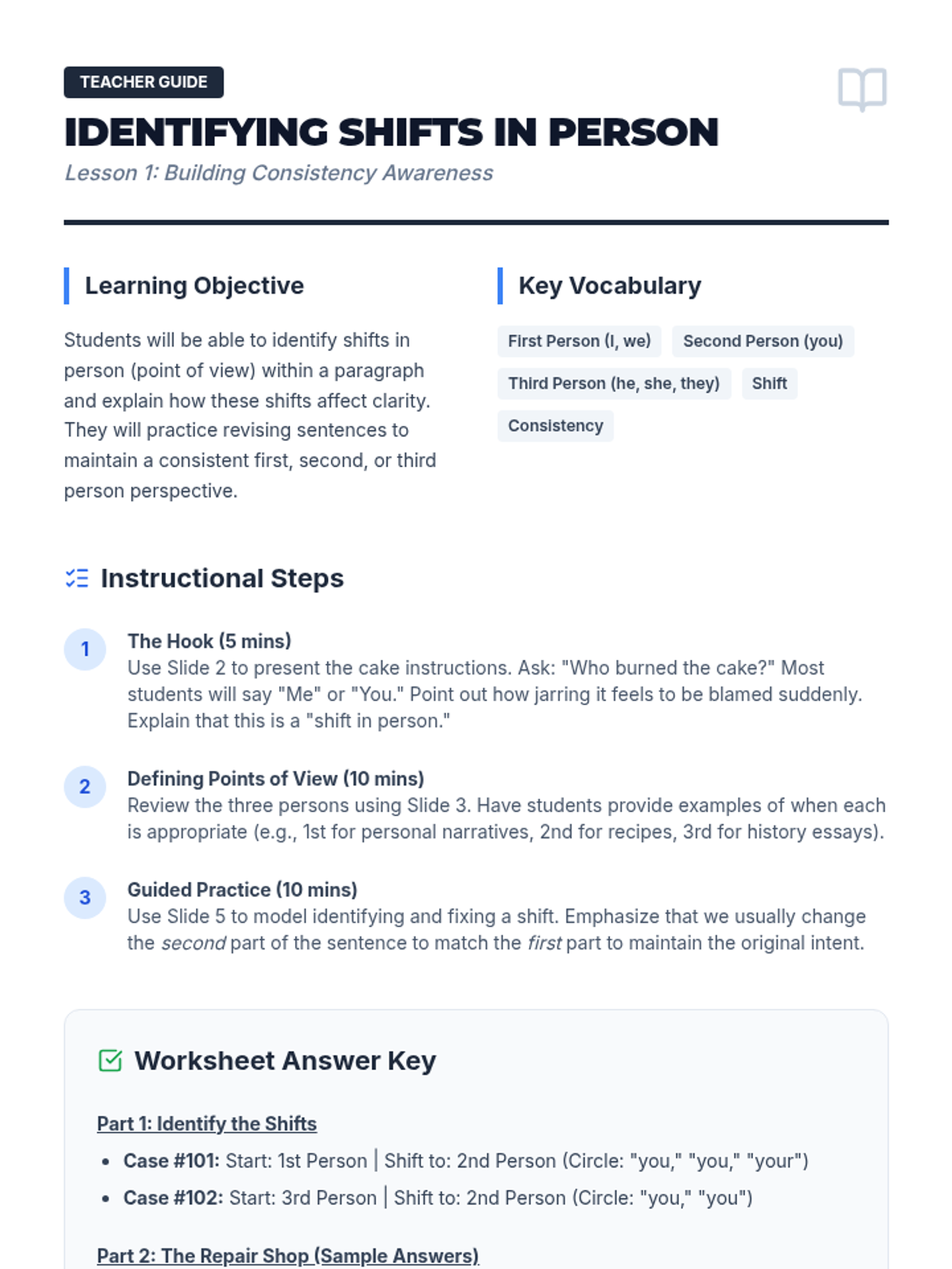 A comprehensive workshop-style sequence for 6th-grade students focusing on pronoun consistency. Students learn to identify and correct shifts in person and number to improve writing clarity and maintain a professional tone.