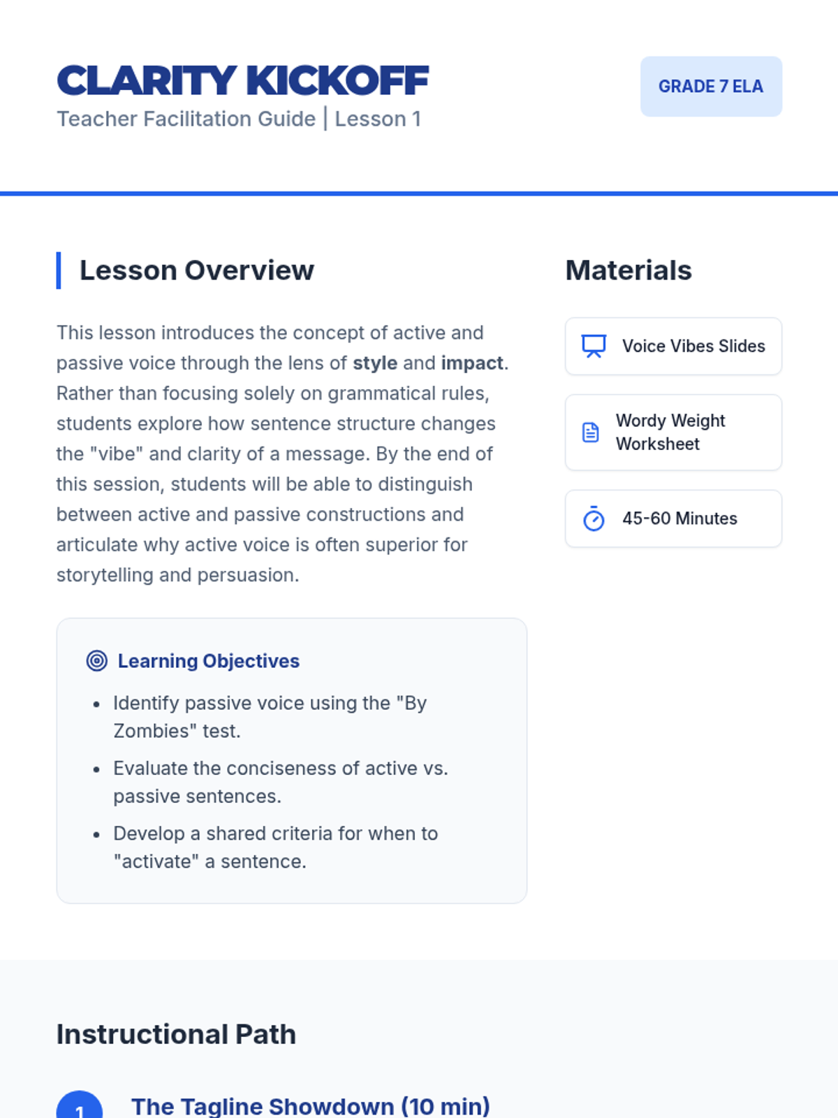 A middle school writing sequence focused on the mastery of active and passive voice. Students learn to identify passive constructions, evaluate their impact on clarity, and revise sentences to increase vigor and directness in their own writing.