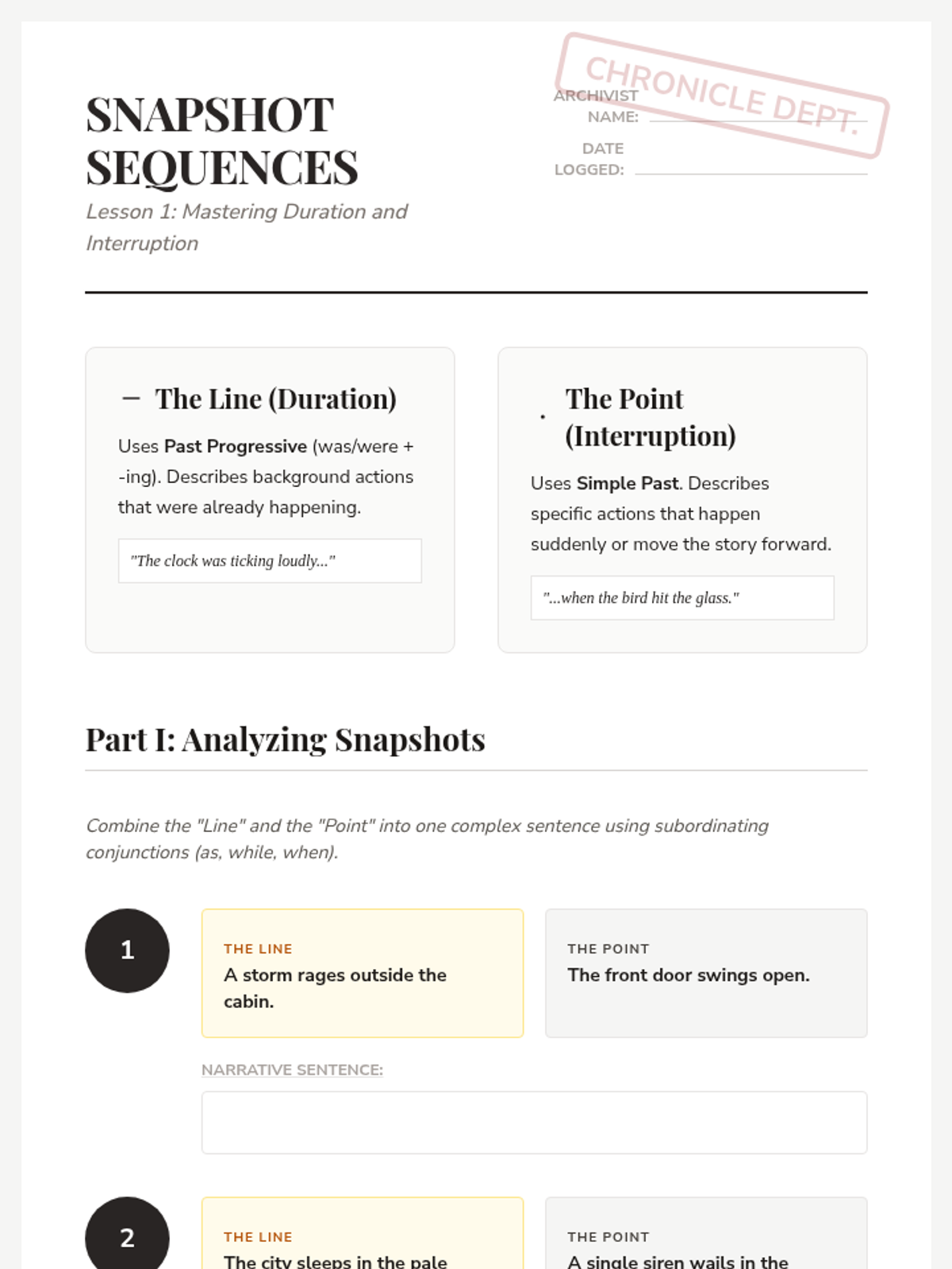 This sequence explores how verb tenses (simple, progressive, and perfect) function as tools for controlling chronology, duration, and pacing in narrative writing. Students will move from understanding basic tense distinctions to mastering complex non-linear storytelling techniques like flashbacks.