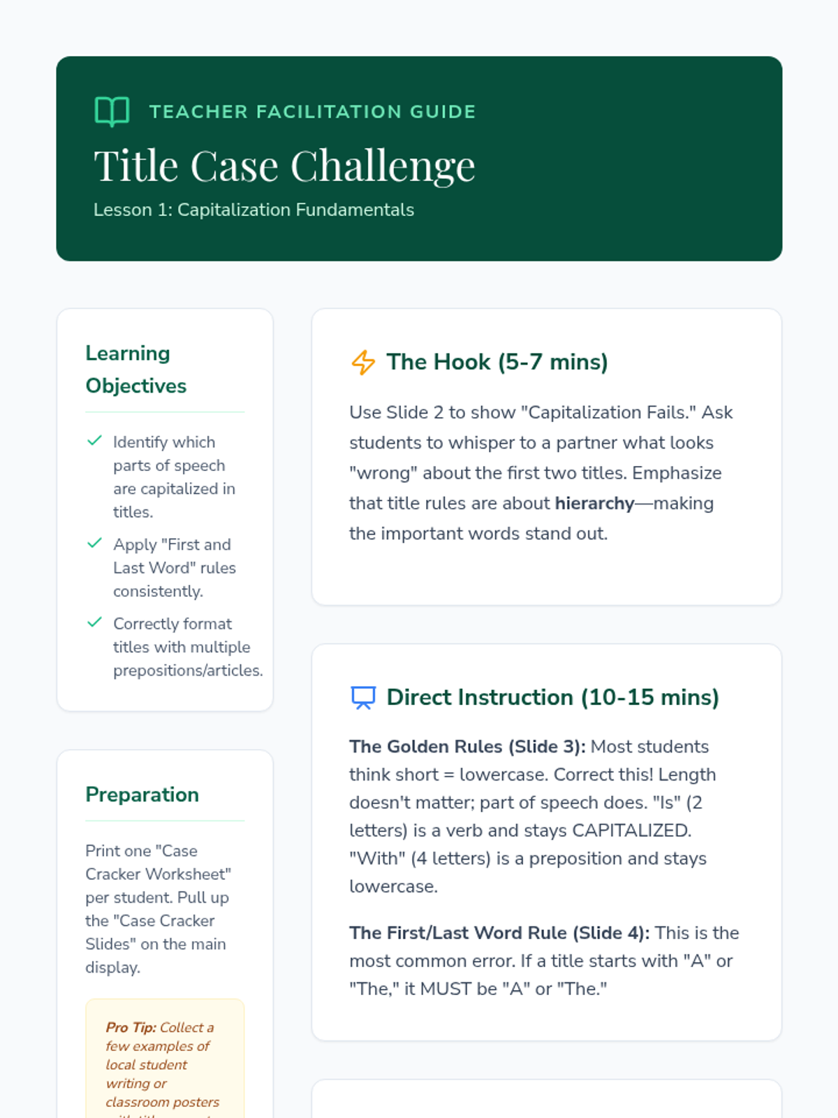 Students explore the rules of capitalization for proper nouns and formatting conventions for titles of long and short works through inquiry-based challenges and project-based learning.