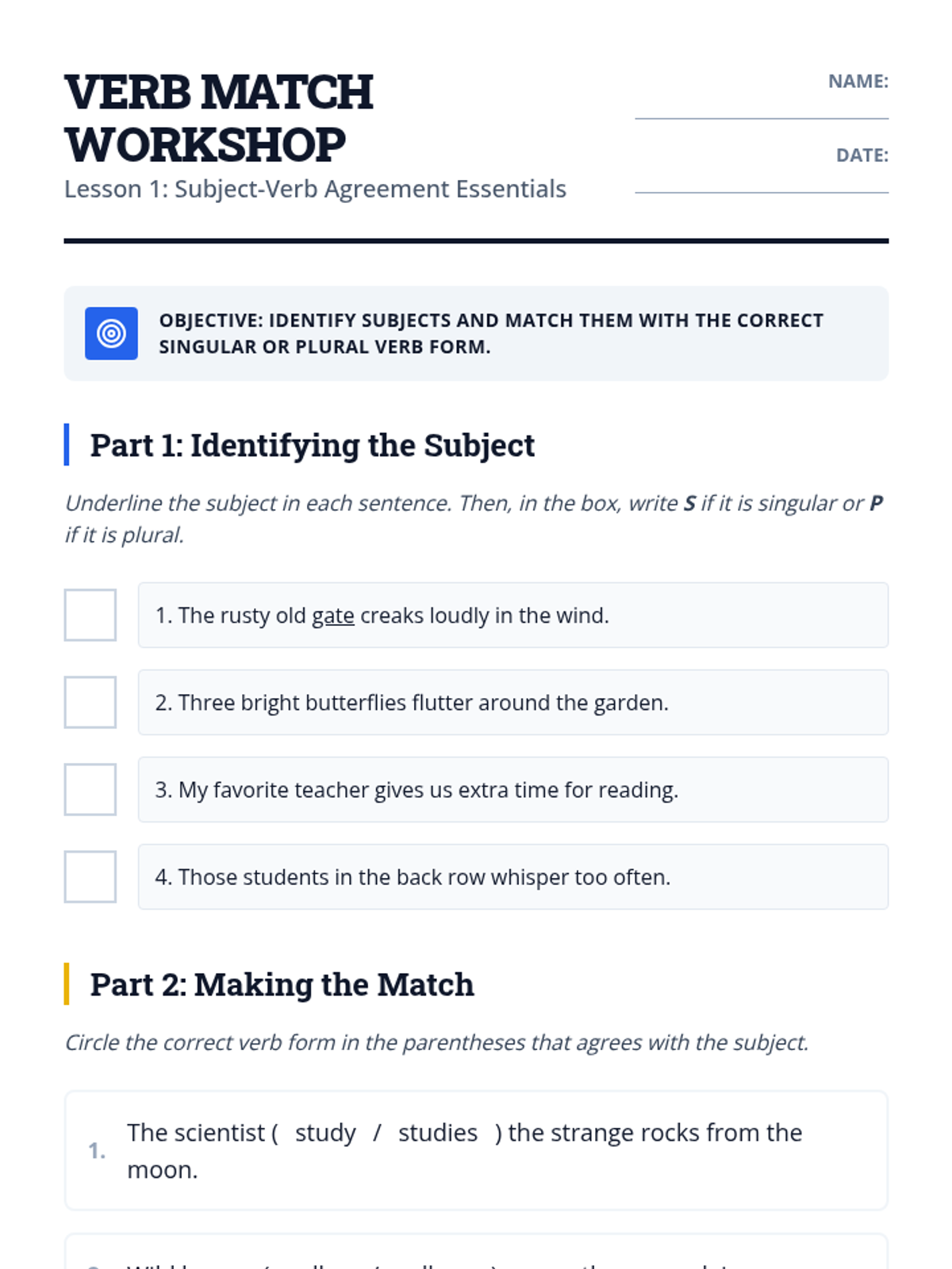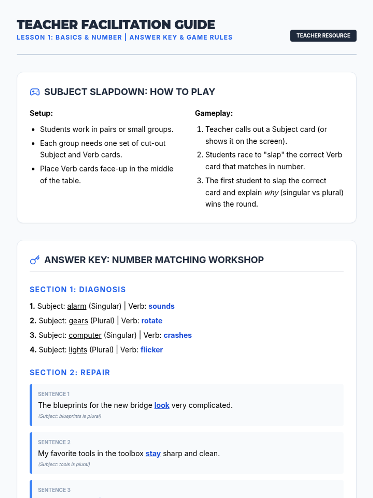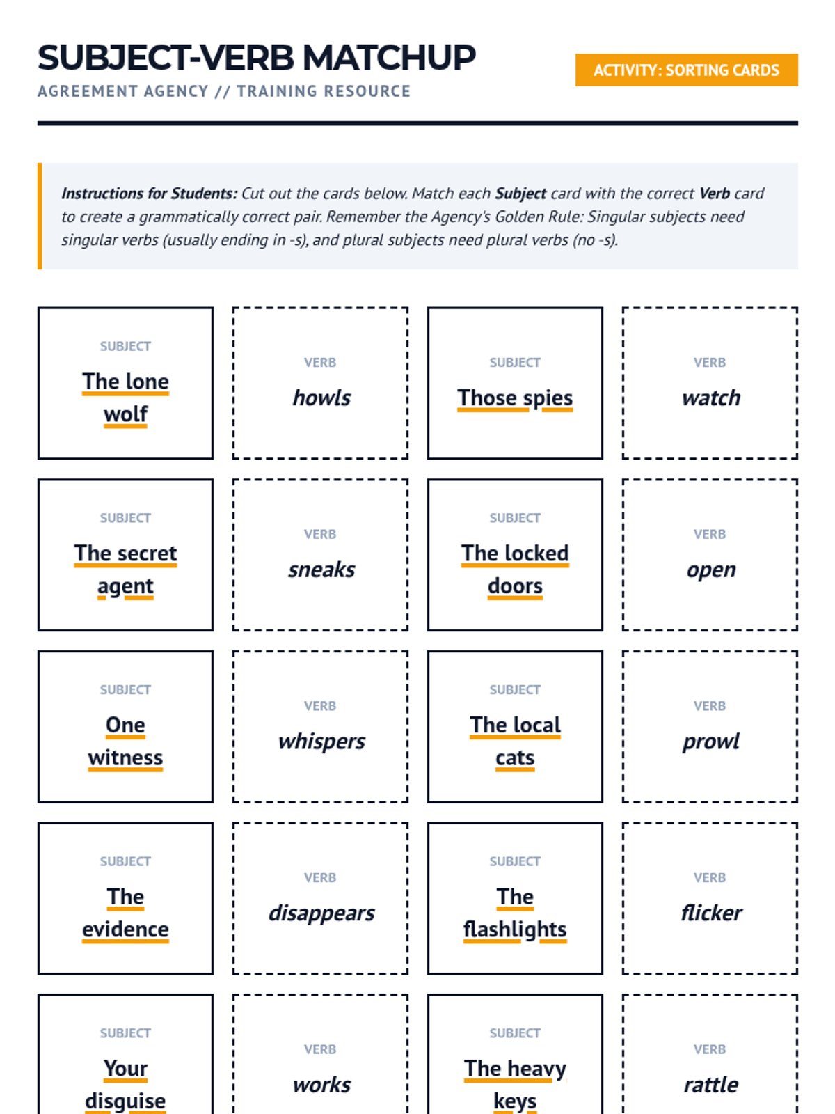 This sequence tackles the complexities of subject-verb agreement, moving beyond simple matching to handle difficult sentence structures. Students engage in error analysis to troubleshoot common pitfalls such as compound subjects, intervening prepositional phrases, and indefinite pronouns.