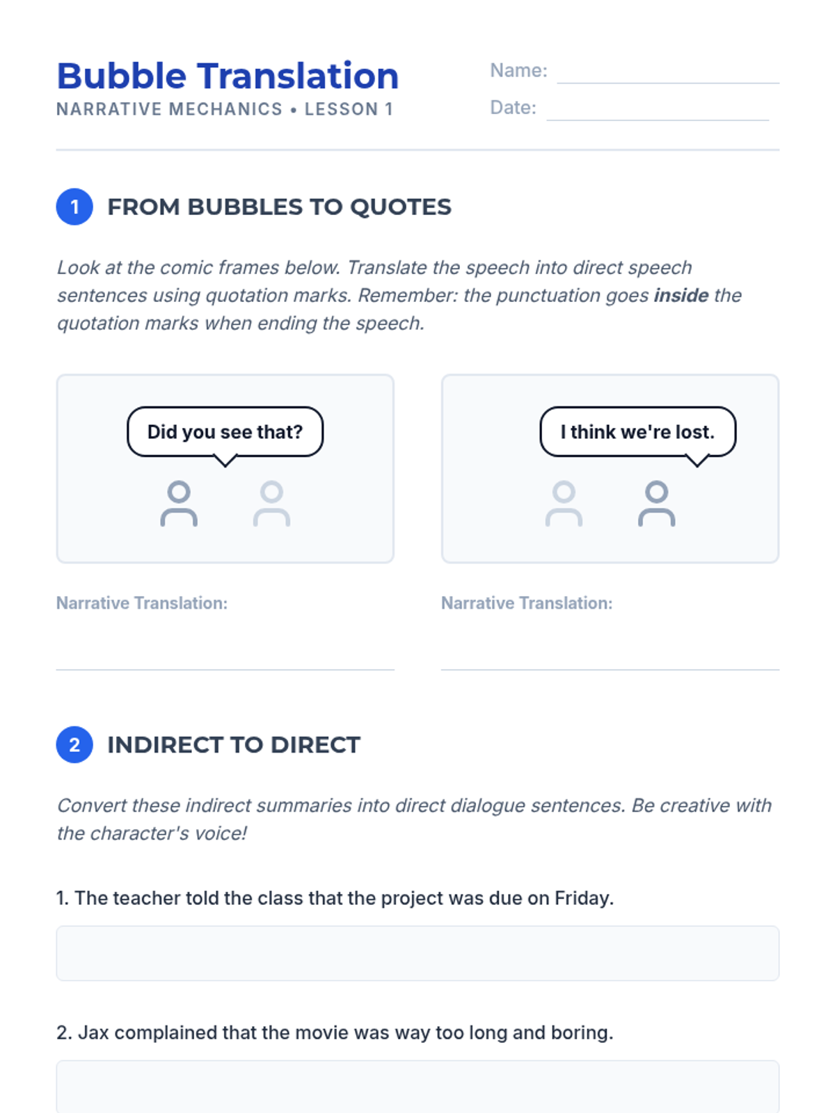 A comprehensive 6th-grade grammar sequence focusing on the mechanics of writing and punctuating dialogue. Students progress from distinguishing direct speech to mastering complex formatting rules like broken quotations and paragraphing in narrative writing.