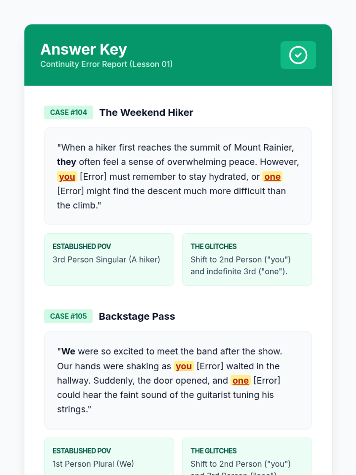 This sequence explores the stylistic impact of pronoun choice, specifically focusing on consistency in person (point of view). Students analyze how shifting from first to second or third person changes the tone and distance of a piece, moving from identifying awkward shifts to making intentional choices in narrative and argumentative writing.