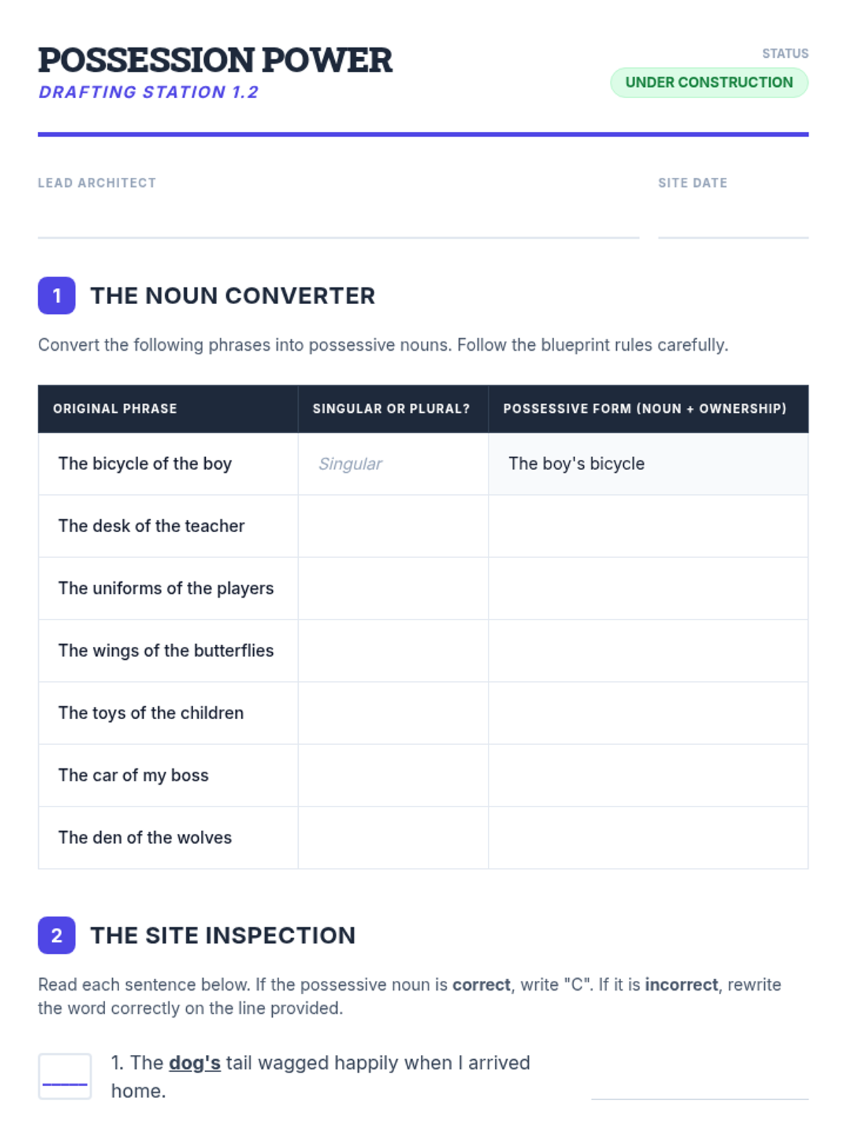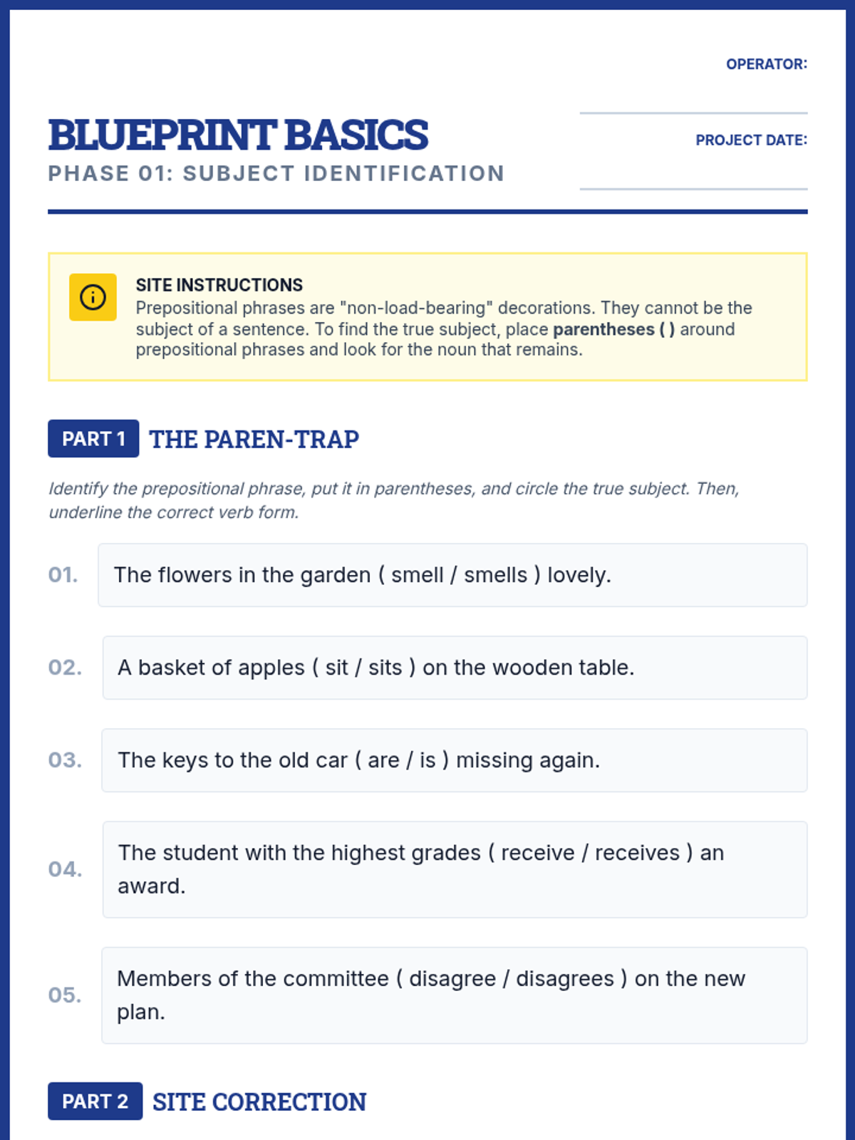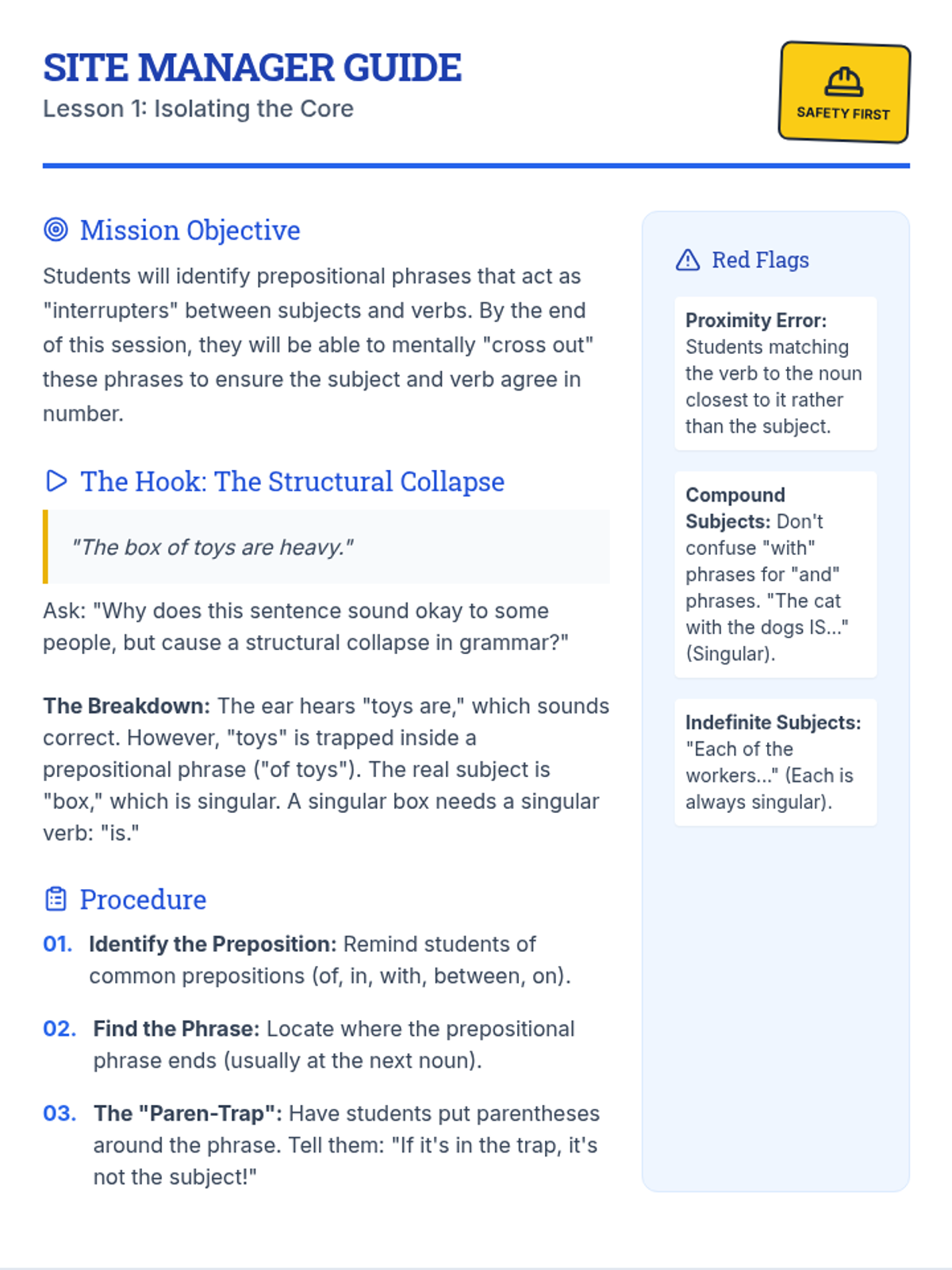 This sequence focuses on Subject-Verb Agreement when prepositional phrases intervene between the subject and the verb. Students learn to identify 'true' subjects, ignore 'interrupters', and maintain grammatical logic in complex sentence structures through a structural engineering-themed workshop approach.