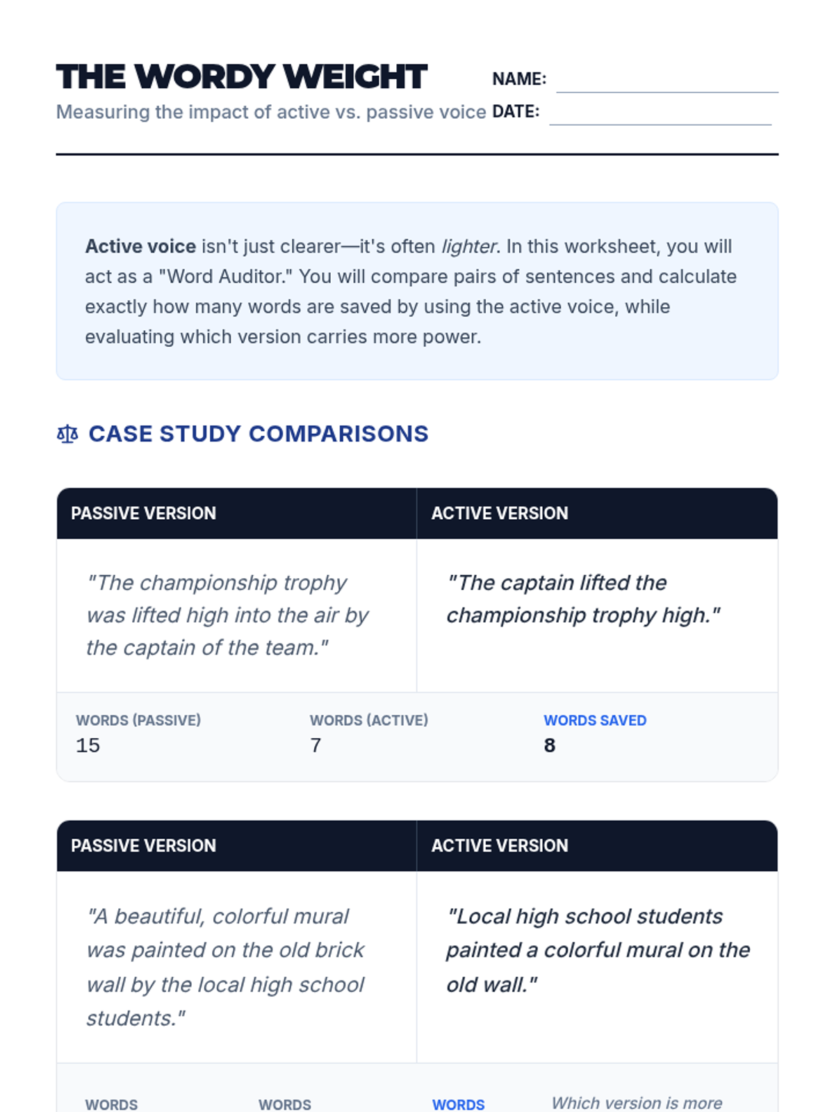 A technical dive into the grammar of active and passive voice. Students move from mapping sentence architecture to masterfully controlling sentence focus through voice manipulation.
