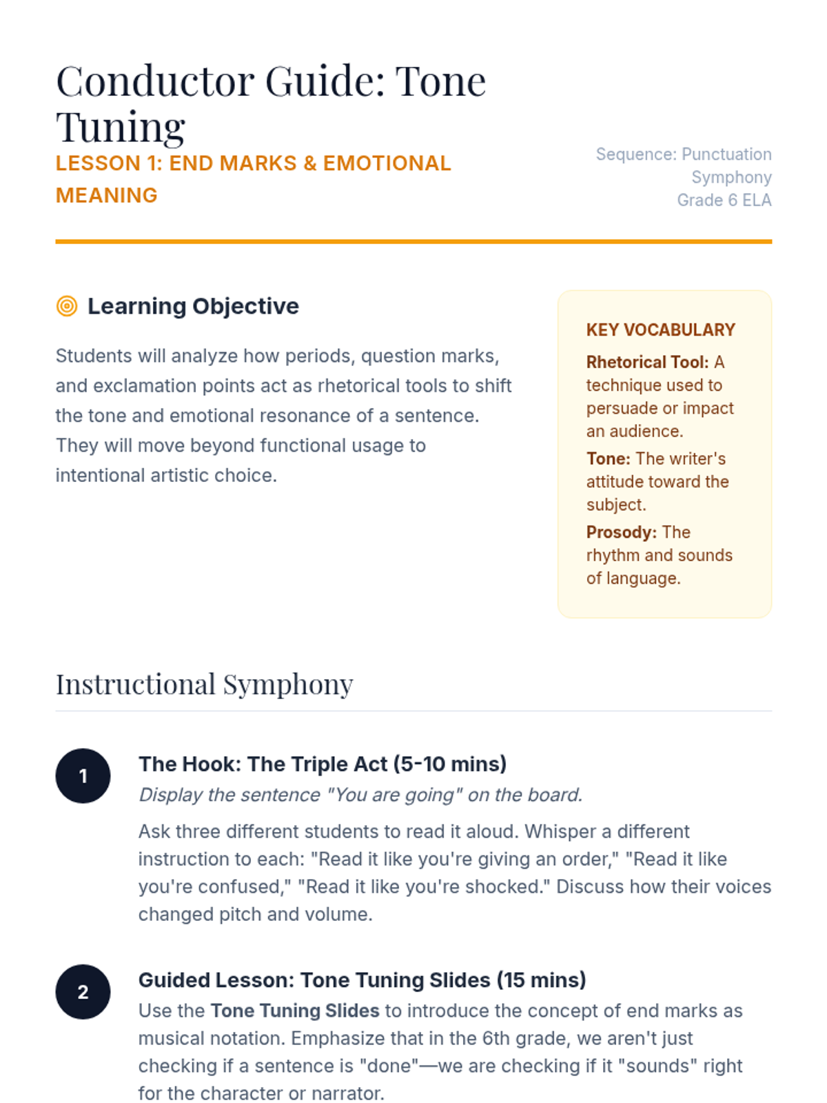 This advanced 6th-grade sequence treats punctuation as a rhetorical tool for voice, tone, and pacing. Students explore how dashes, ellipses, parentheses, and end marks act as 'musical notation' for the written word, moving beyond basic grammar to expressive writing.