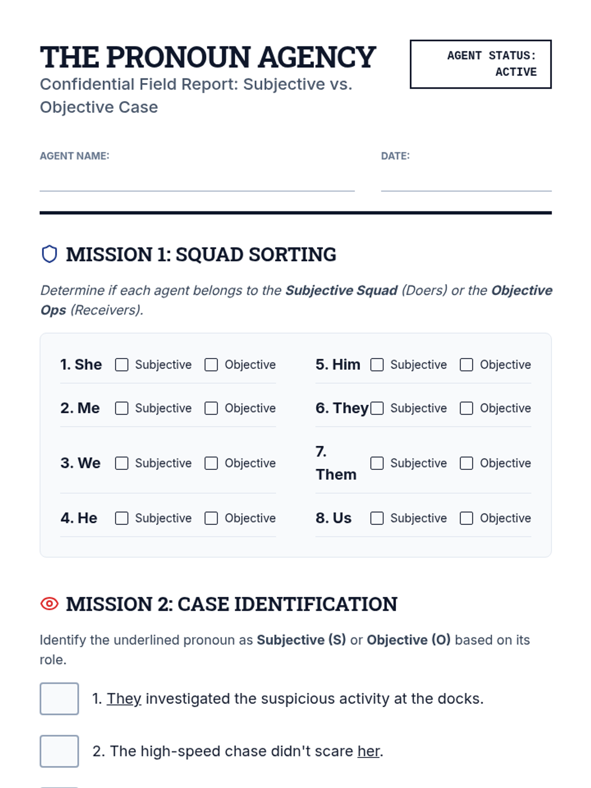 A comprehensive 6th-grade grammar sequence focusing on the correct application of subjective, objective, and possessive pronoun cases through a secret agent detective theme.