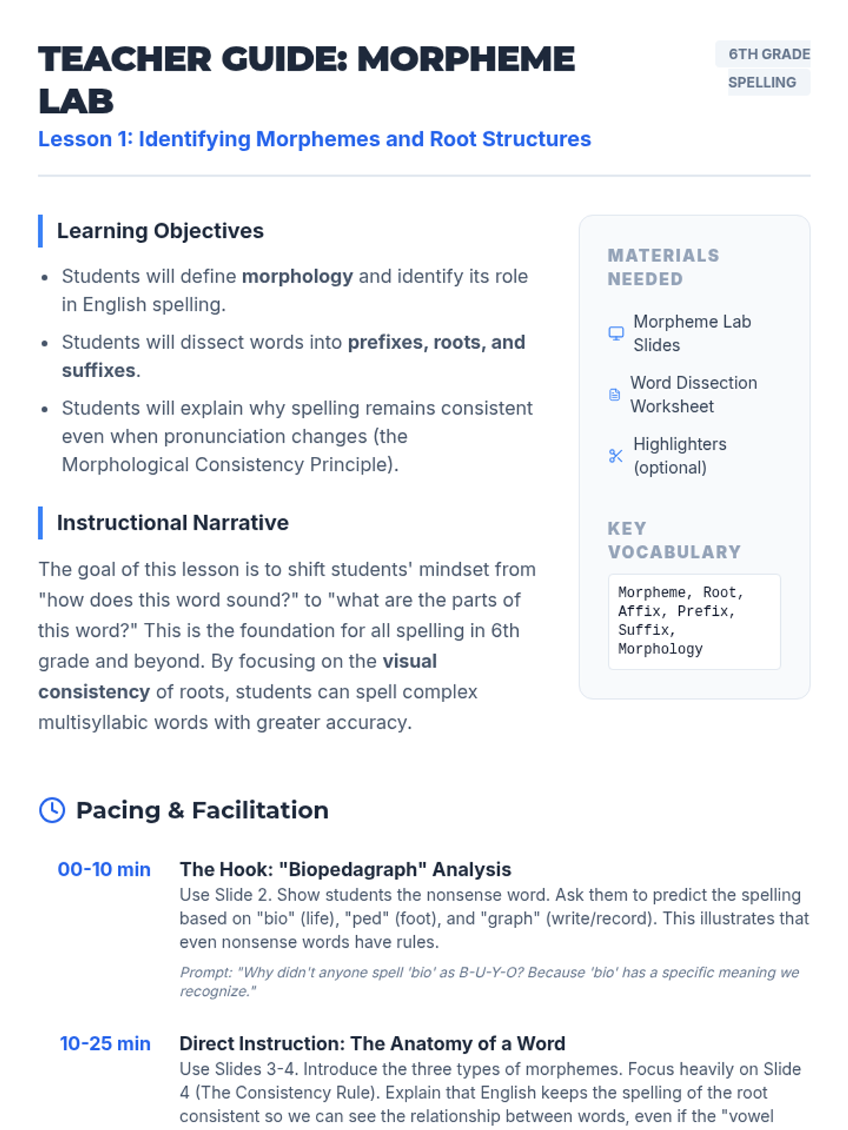A 6th-grade spelling sequence that moves students away from rote memorization toward structural analysis by focusing on Greek and Latin roots, prefixes, and suffixes. Students learn the logic of English spelling through morphological dissection and synthesis.