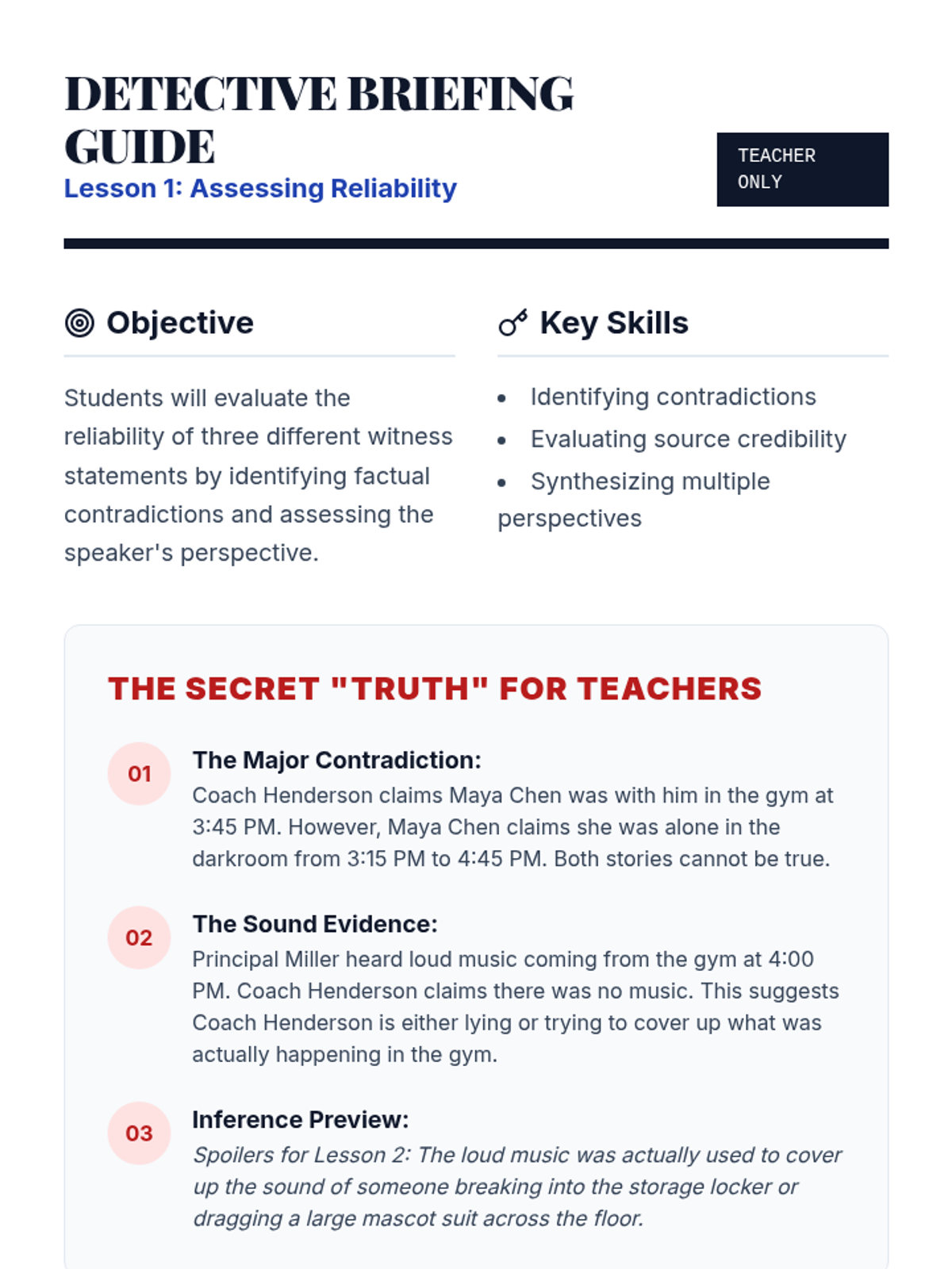 A reading comprehension sequence for 6th grade ELLs where students act as detectives, synthesizing evidence from various text types (interviews, maps, emails) to solve a central mystery while building skills in inference and source evaluation.