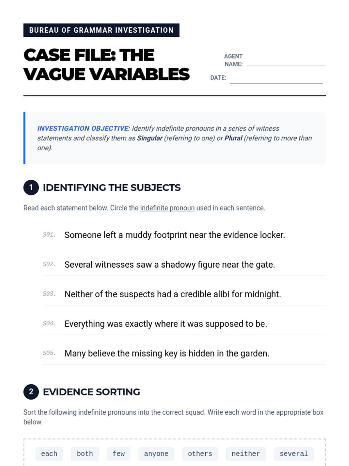 This sequence explores the nuances of indefinite pronouns, focusing on classification, singular/plural agreement, and variable pronouns based on context. Students apply these rules through investigative simulations and copy-editing tasks.