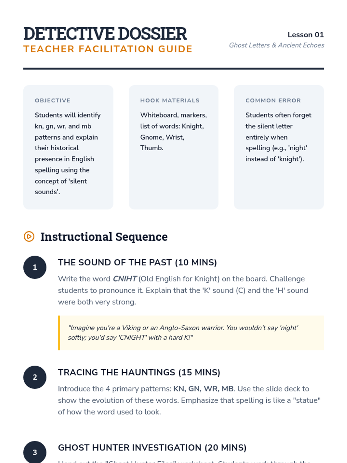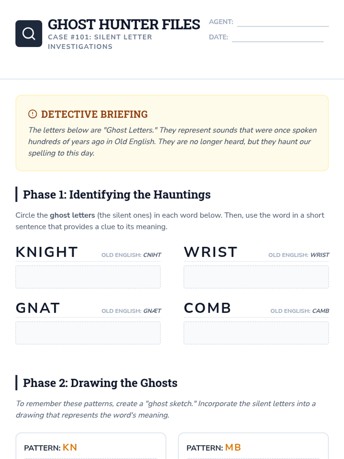 A 6th-grade spelling unit that explores the historical origins of English words. Students act as 'linguistic detectives' to understand why certain words have silent letters or non-phonetic patterns by tracing them back to Old English, French, and other global languages.