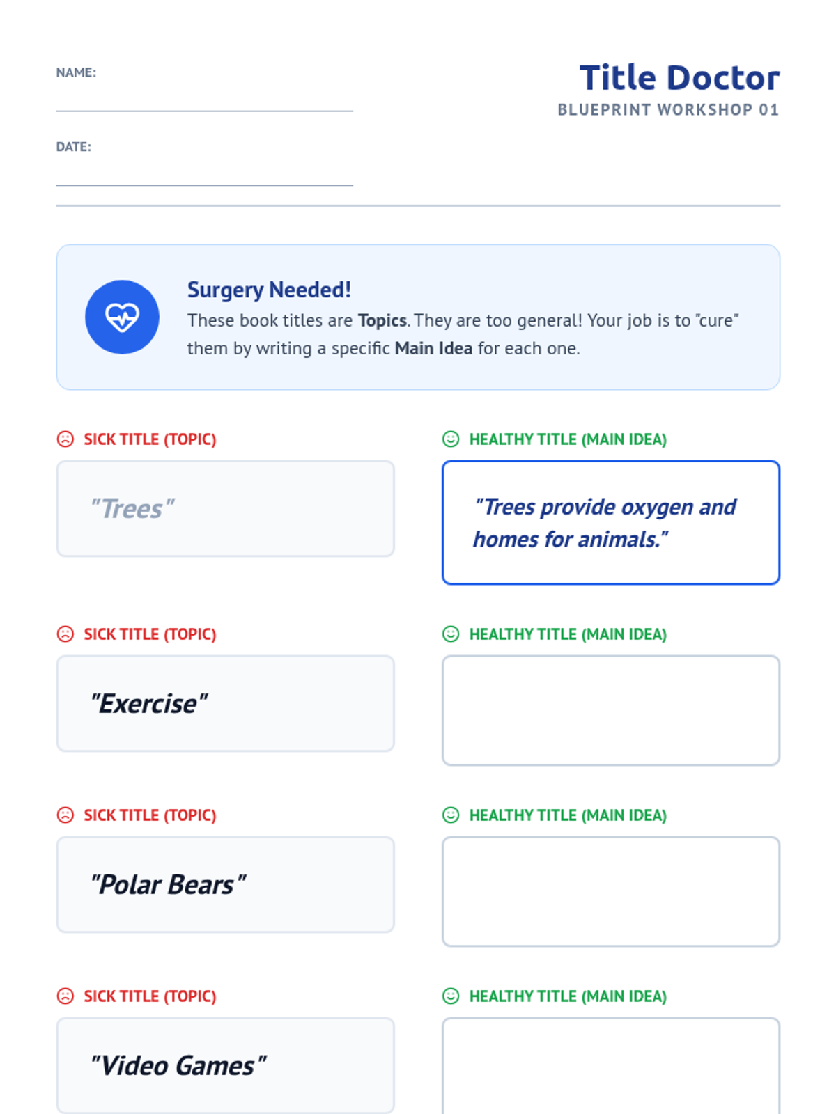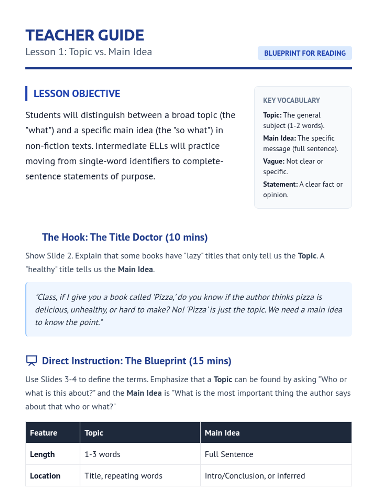 This sequence focuses on the hierarchy of information within non-fiction texts for intermediate ELLs. Students learn to distinguish between topics, main ideas, and supporting details using visual analogies and structured frameworks.