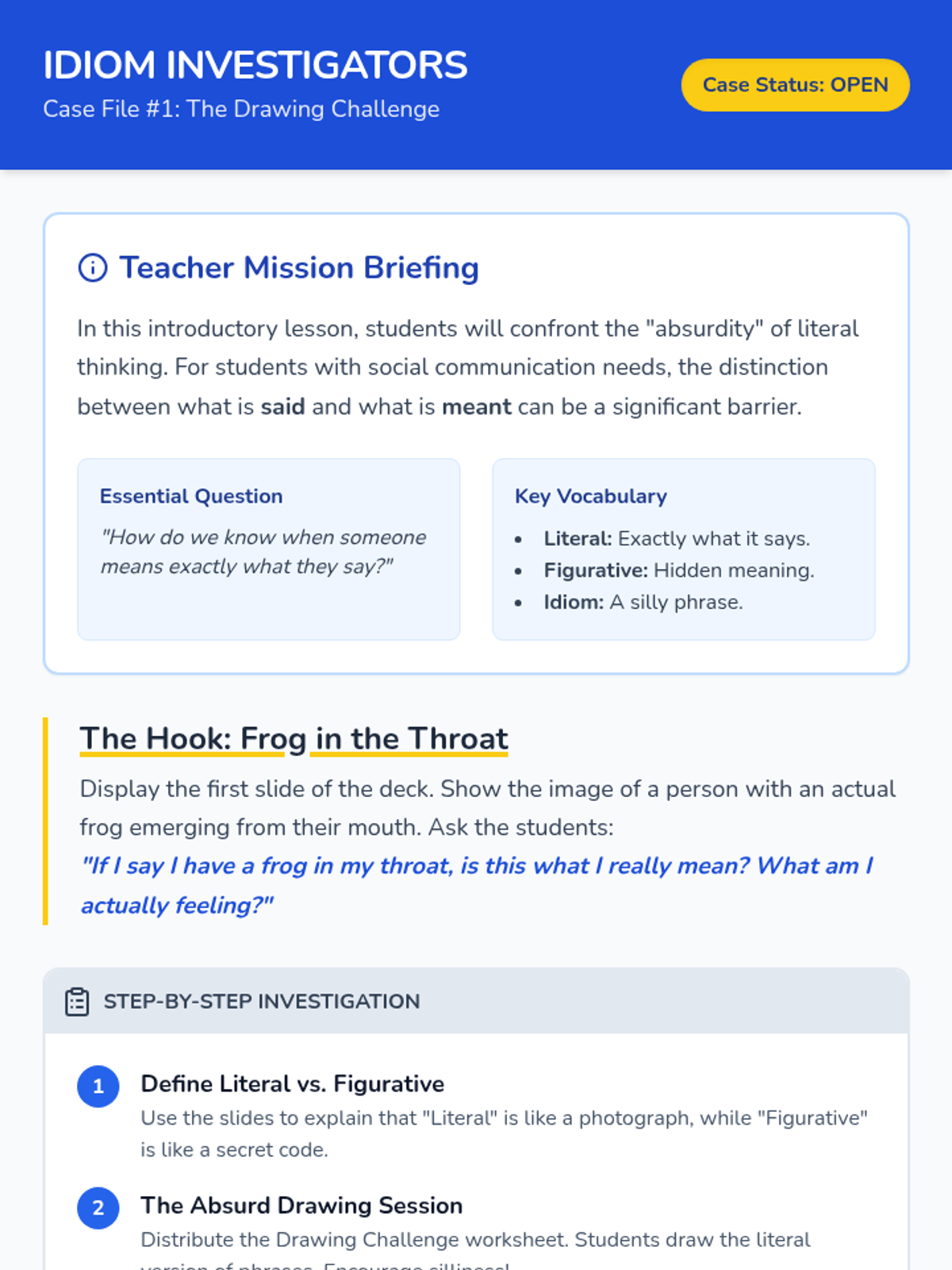 An intermediate ESL sequence where students act as 'communication detectives' to analyze tone, idioms, exaggeration, and speaker intent in spoken English. The sequence culminates in a mystery simulation requiring students to synthesize all listening skills to solve a case.