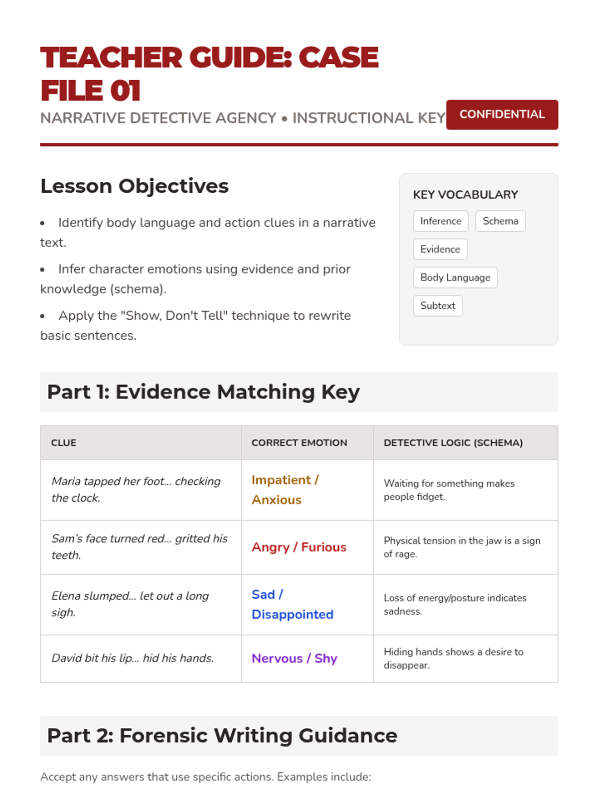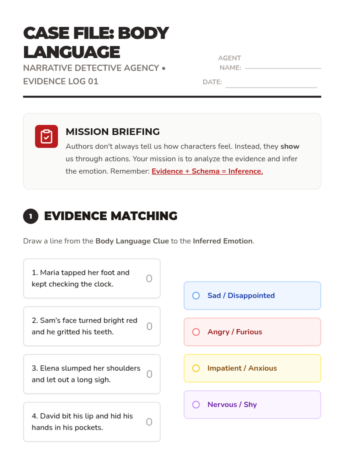 A comprehensive reading comprehension unit for 5th-grade ELL students focused on inferring character motivations, subtext, and narrative tone using a detective agency theme. Students act as 'Narrative Detectives' to uncover hidden meanings in fiction through body language, dialogue, and word choice.
