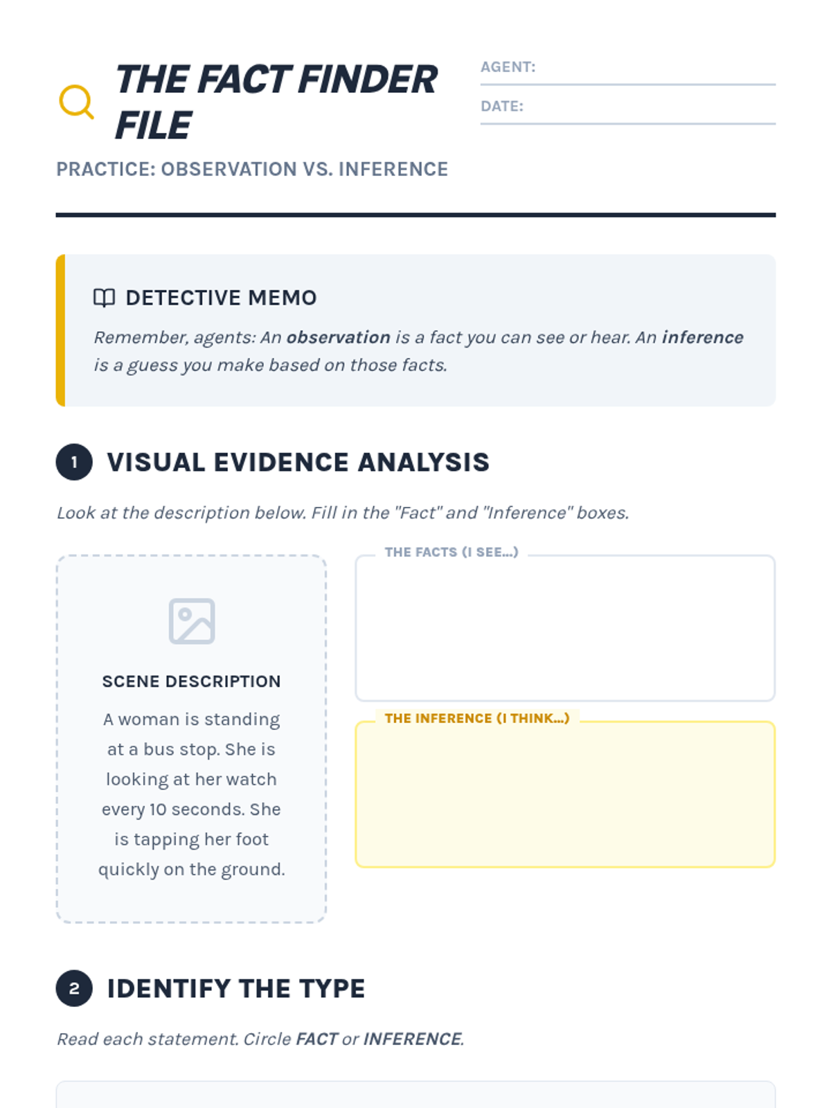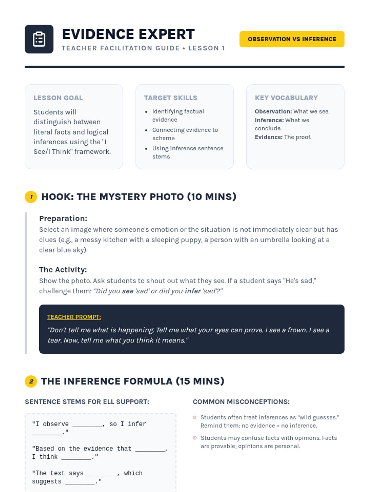 A 5-lesson sequence for 6th Grade Intermediate ELL students focusing on making inferences in fiction. Students transition from literal observation to nuanced inference, analyzing character actions, dialogue, and setting to uncover hidden motivations and plot developments using a 'Show, Don't Tell' framework.