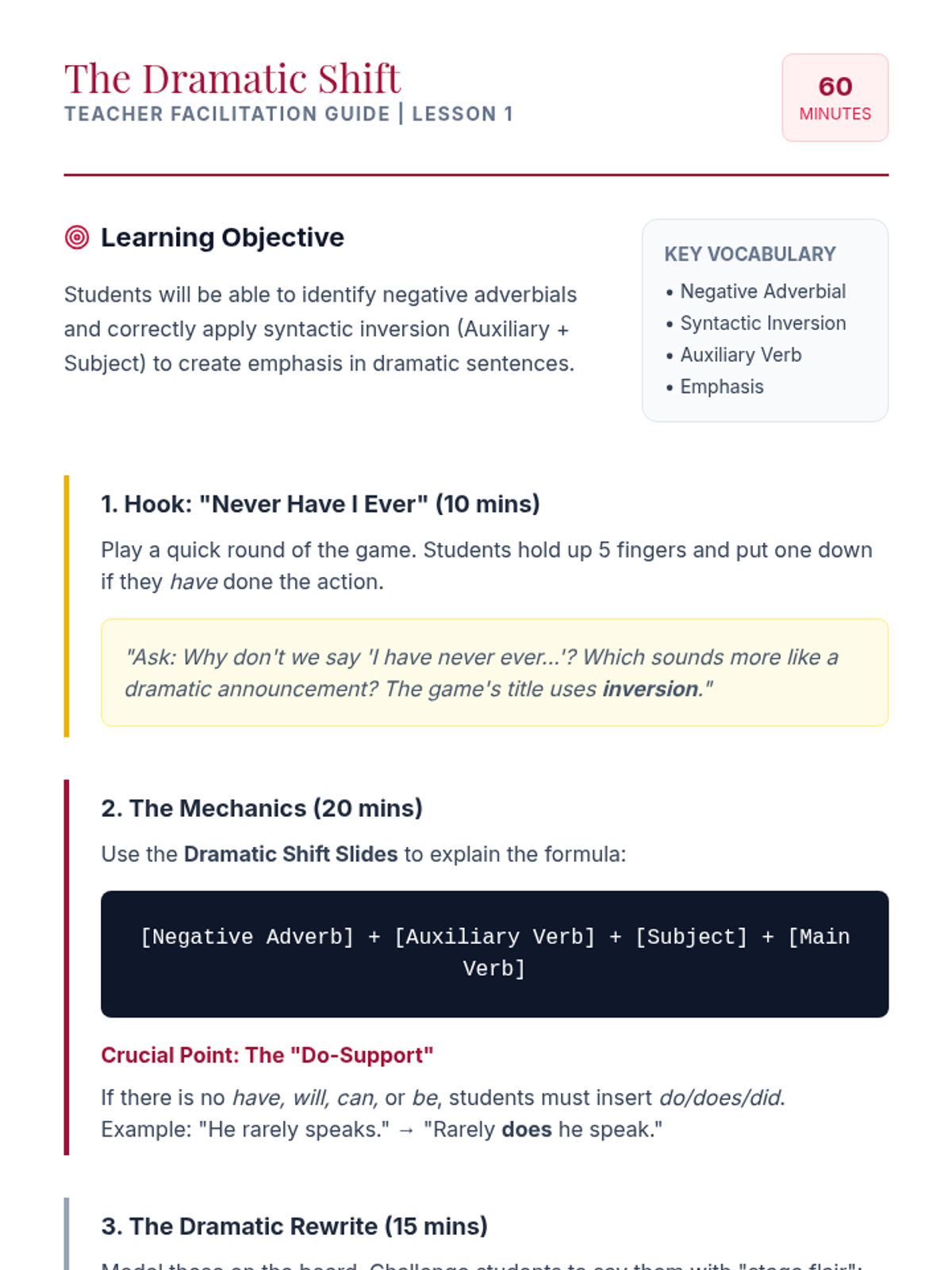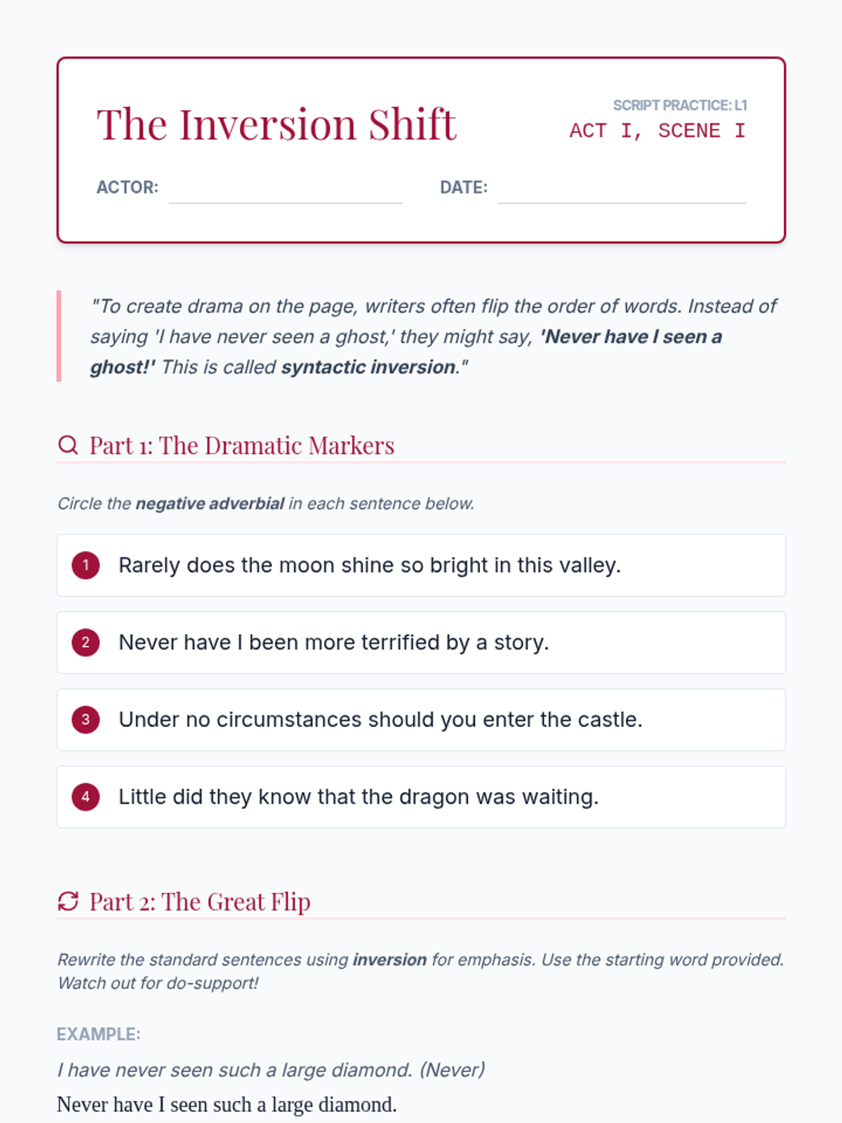 This advanced grammar sequence for 6th grade ELL students explores syntactic inversion as a tool for emphasis and dramatic effect. Students master complex structures like negative adverbials, time-based inversion, and place-based movement to enhance their narrative and persuasive writing.