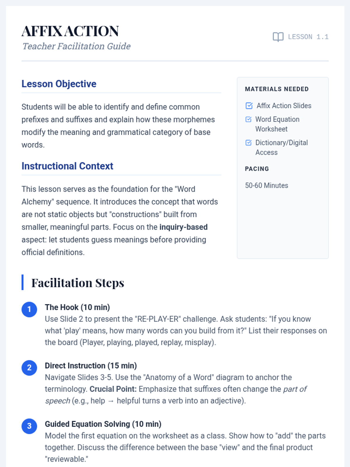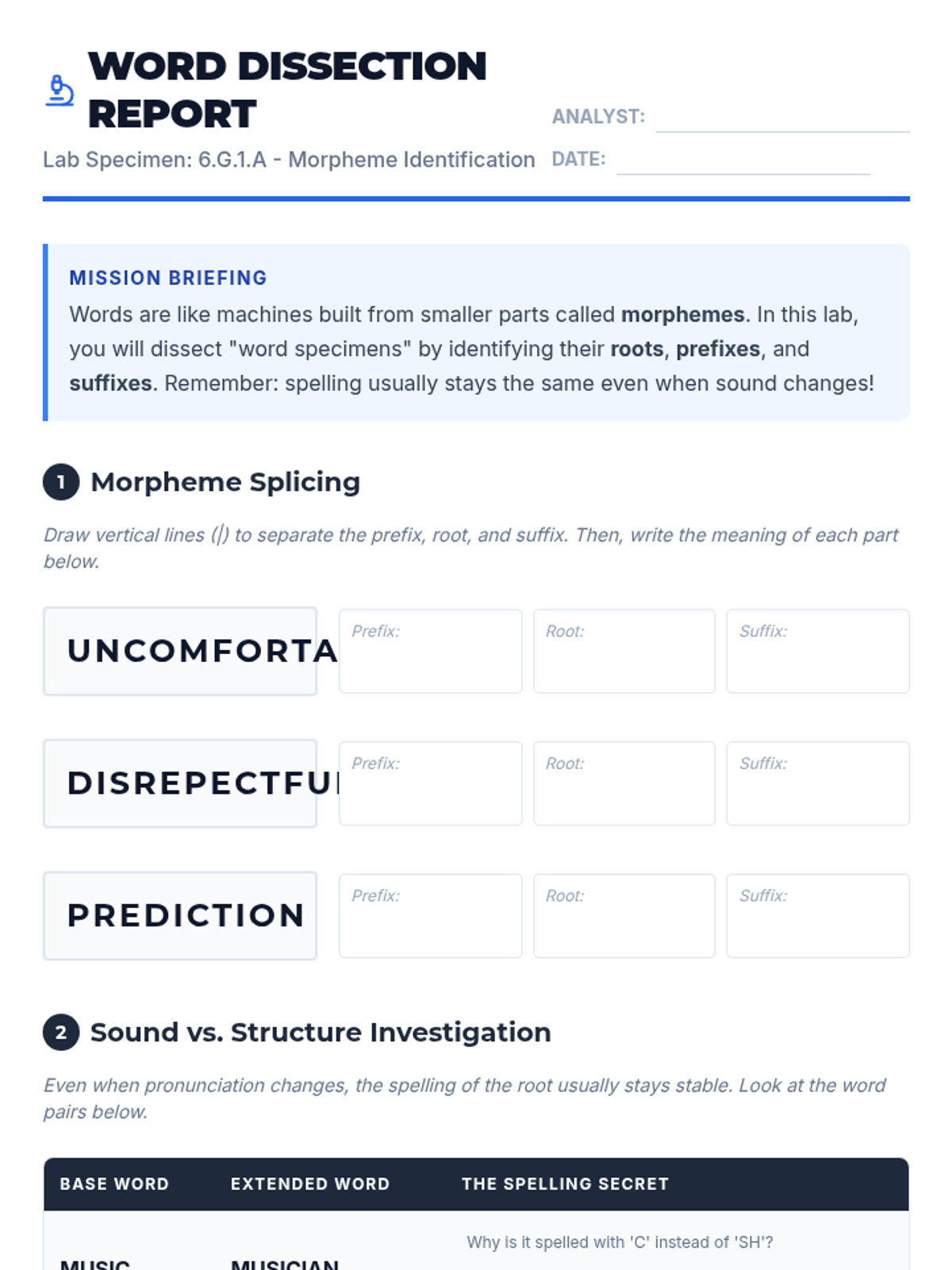 A comprehensive 6th-grade sequence that empowers students to decode complex vocabulary by analyzing Greek and Latin roots, prefixes, and suffixes through gamified and inquiry-based activities.