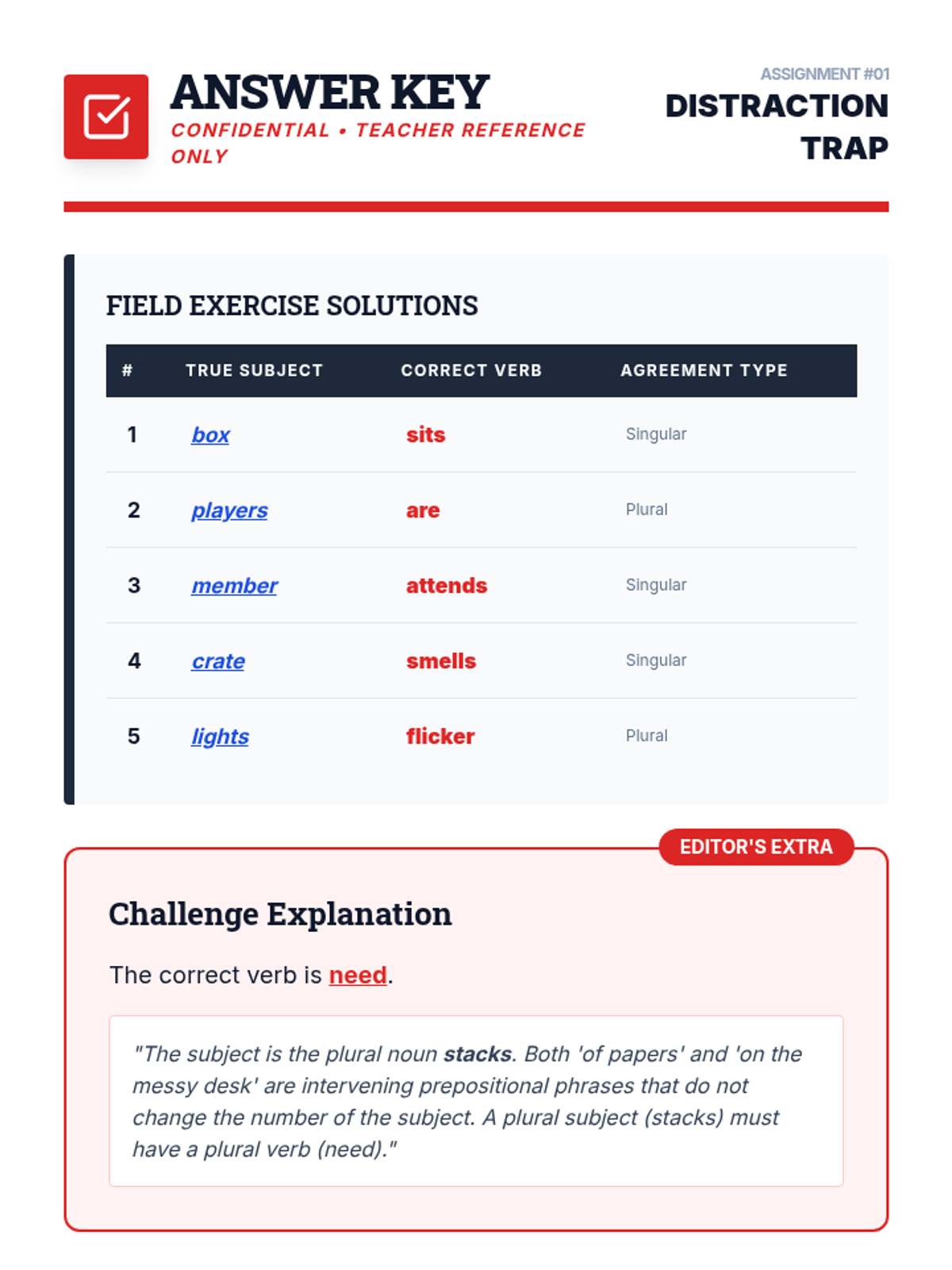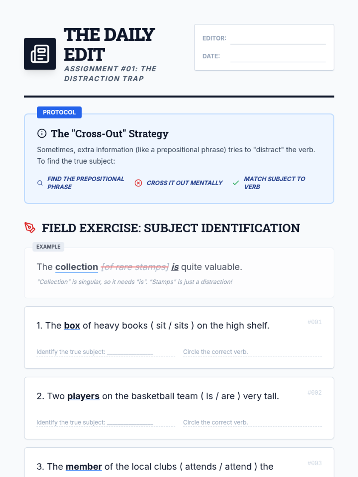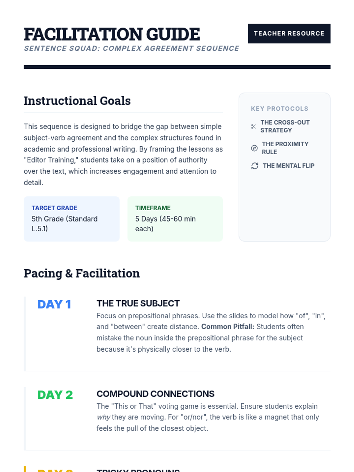 This 5th-grade grammar sequence guides students through the complexities of subject-verb agreement, focusing on intervening phrases, compound subjects, indefinite pronouns, and inverted sentences through a 'Copy Editor' simulation.