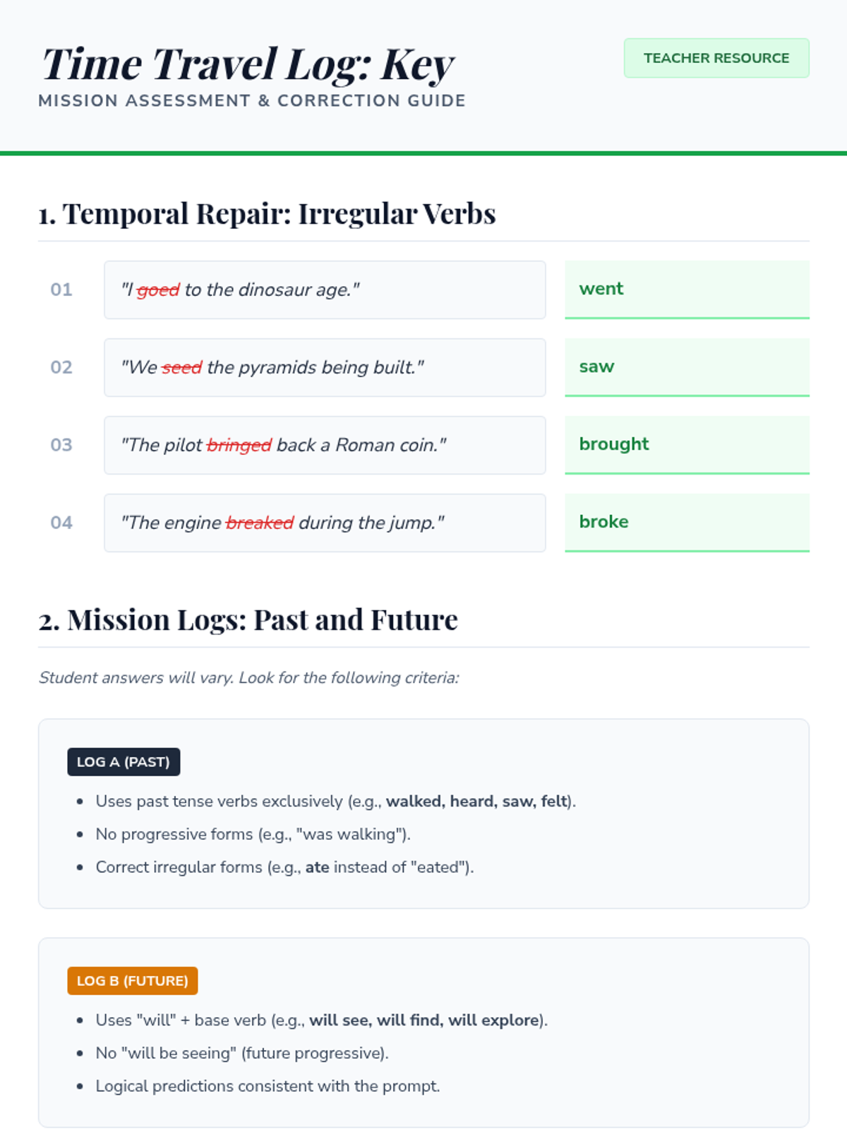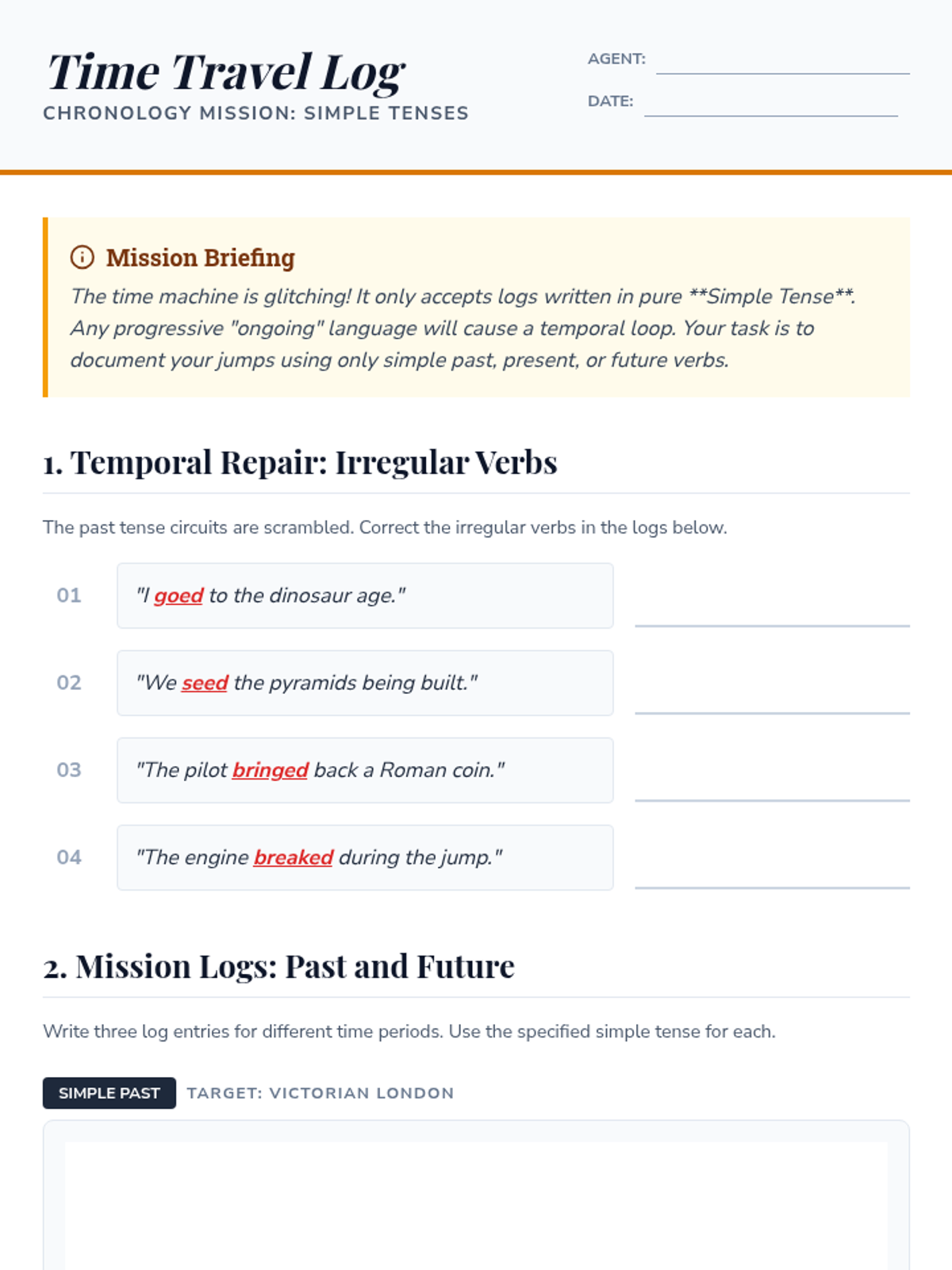 Students explore the concept of time in grammar by contrasting simple tenses with progressive forms. This sequence emphasizes the 'timeline' visual, helping students understand the specific nuances between an action that happens once (simple) versus one that is ongoing (progressive).