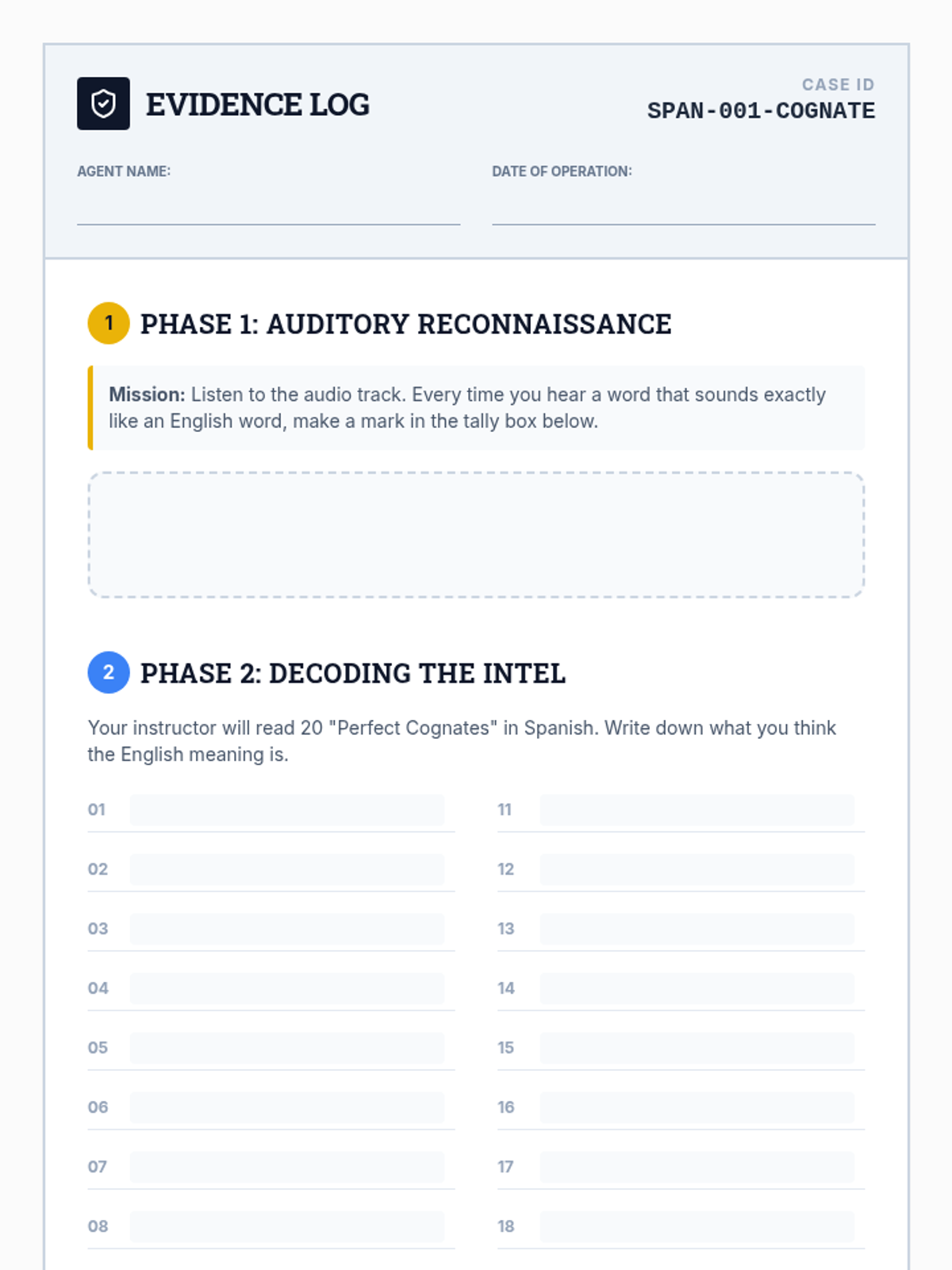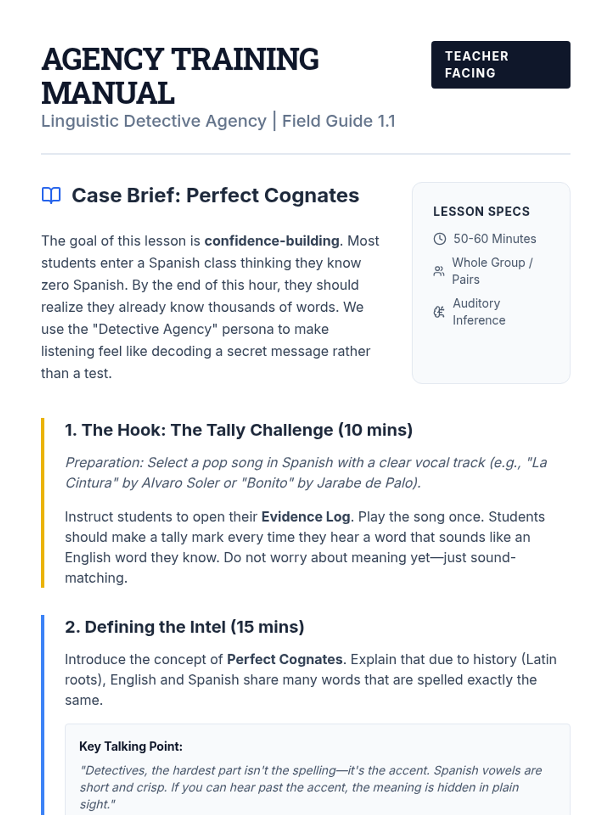 An inquiry-based Spanish listening sequence for 6th graders. Students act as 'Linguistic Detectives' to decode Spanish using cognates, pattern recognition, and context clues, moving from perfect cognates to full media analysis.