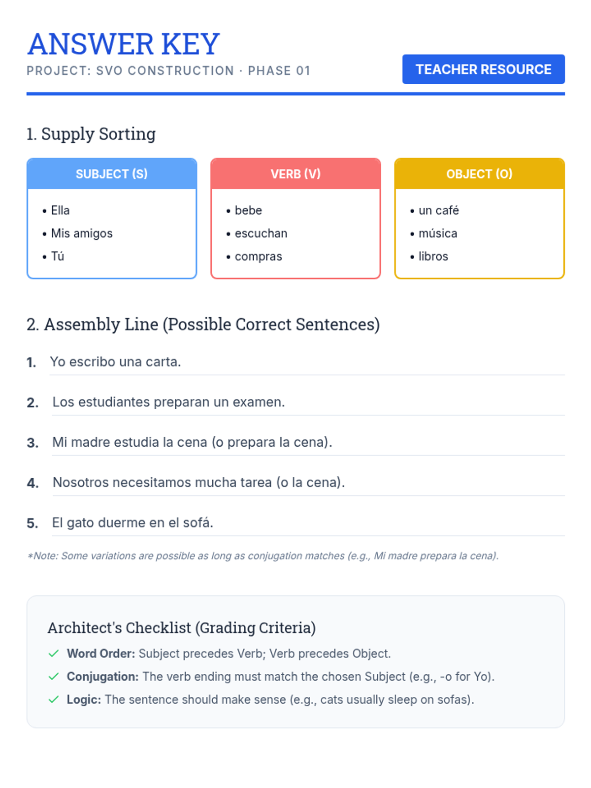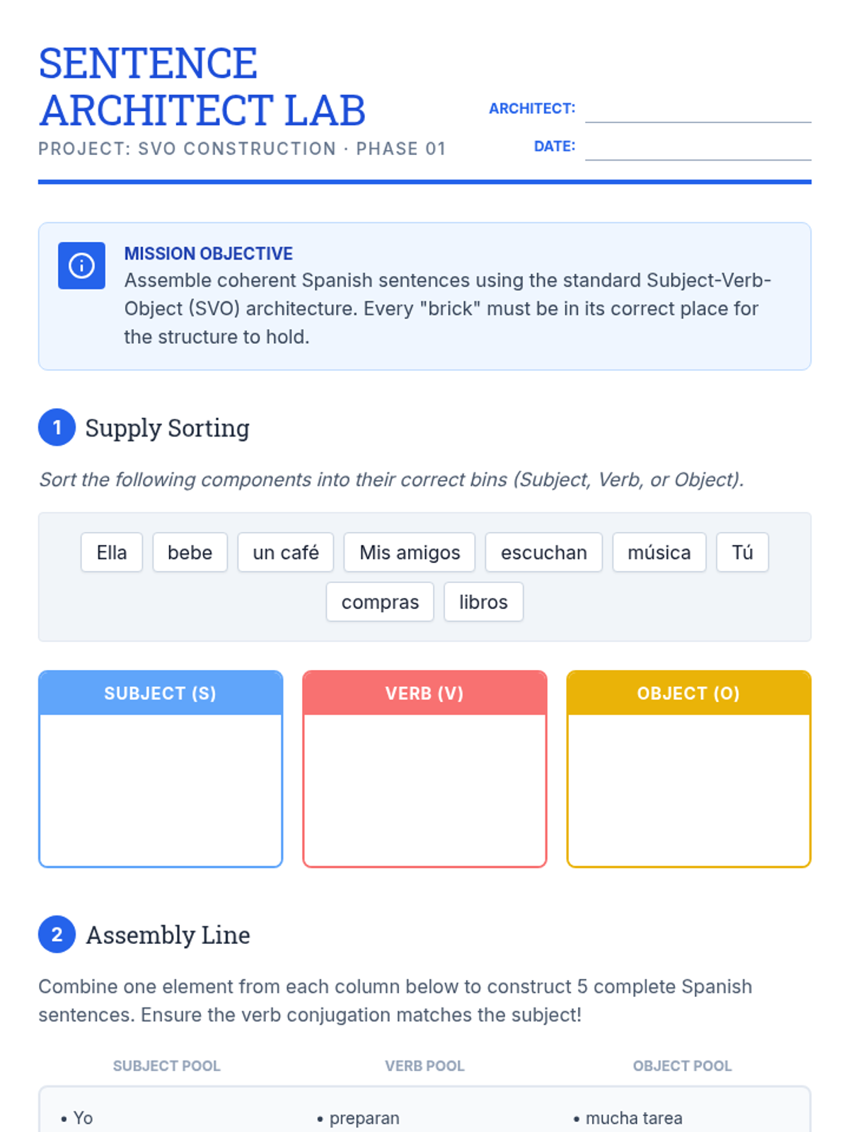 A workshop-style sequence where students move from isolated words to building coherent affirmative, negative, and interrogative sentences in Spanish. Focuses on the "architecture" of language and how word order affects meaning.