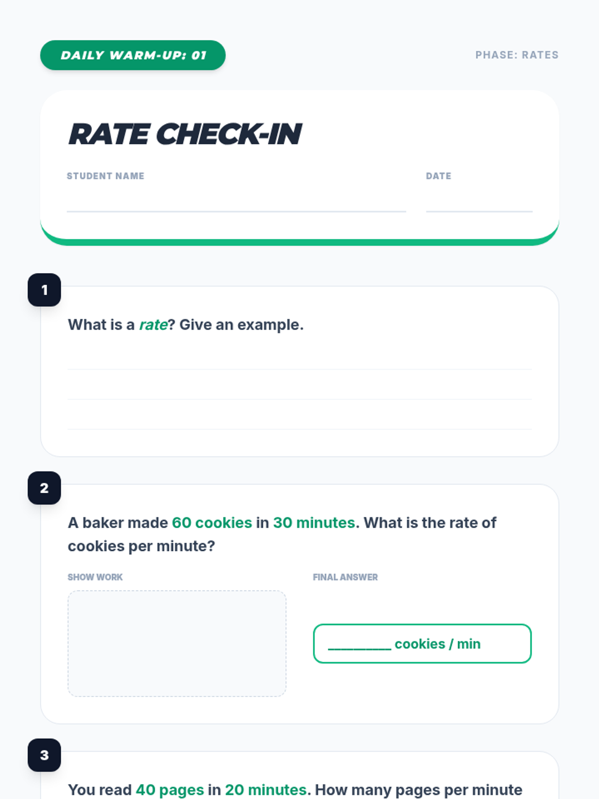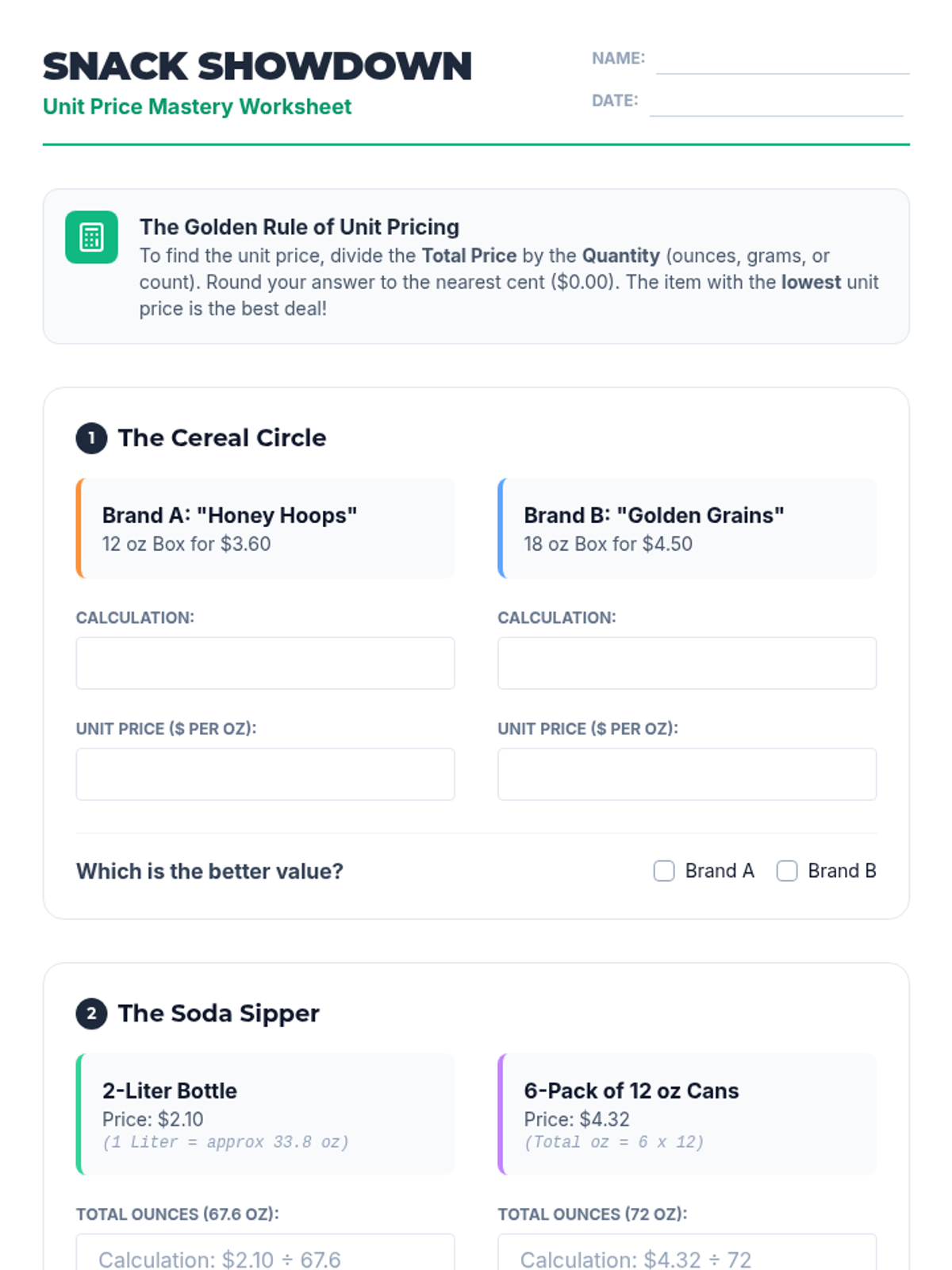 This project-based sequence guides students through the practical application of unit rates in financial and physical contexts. Students calculate basic unit prices, solve complex fraction rates, and analyze constant speed through graphing, culminating in a consumer analysis project.