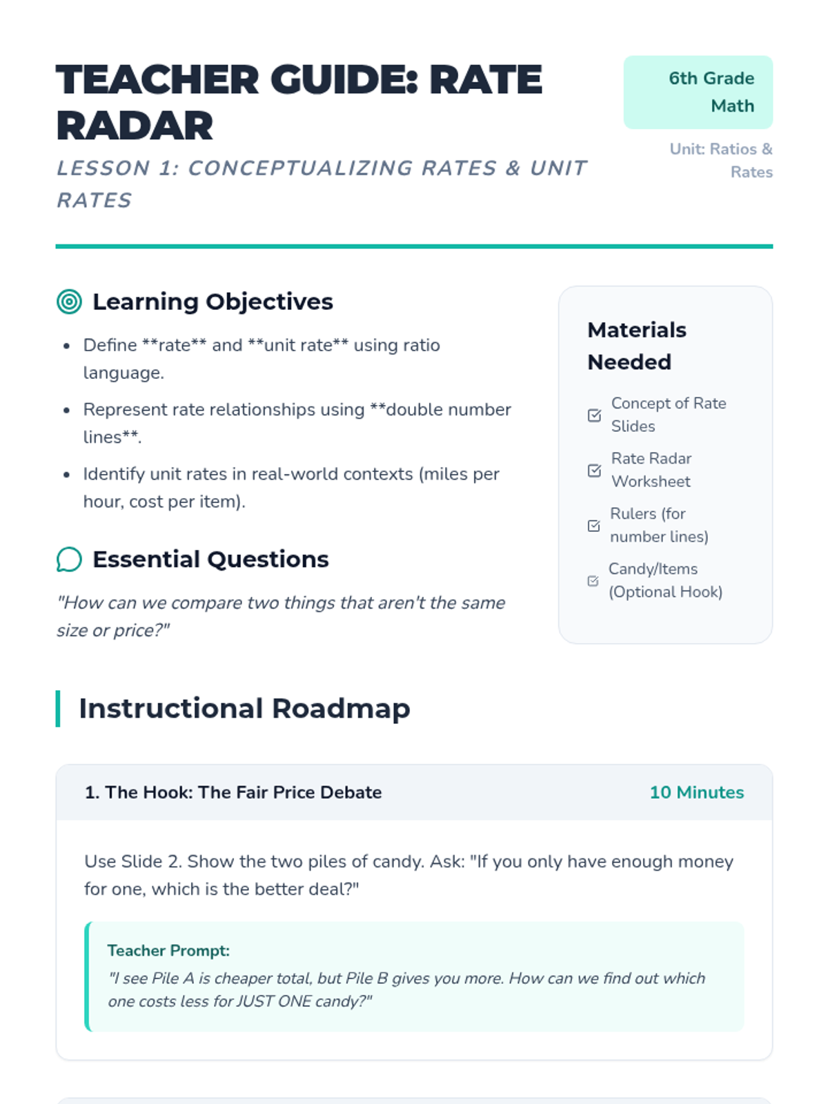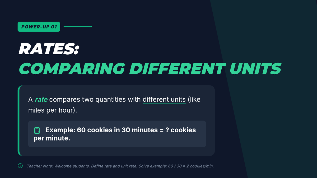 A comprehensive 6th-grade math sequence on unit rates, taking students from conceptual understanding with visual models to real-world applications in shopping, travel, and budgeting. Students will master calculating 'the cost of one' and 'miles per hour' to make informed decisions.