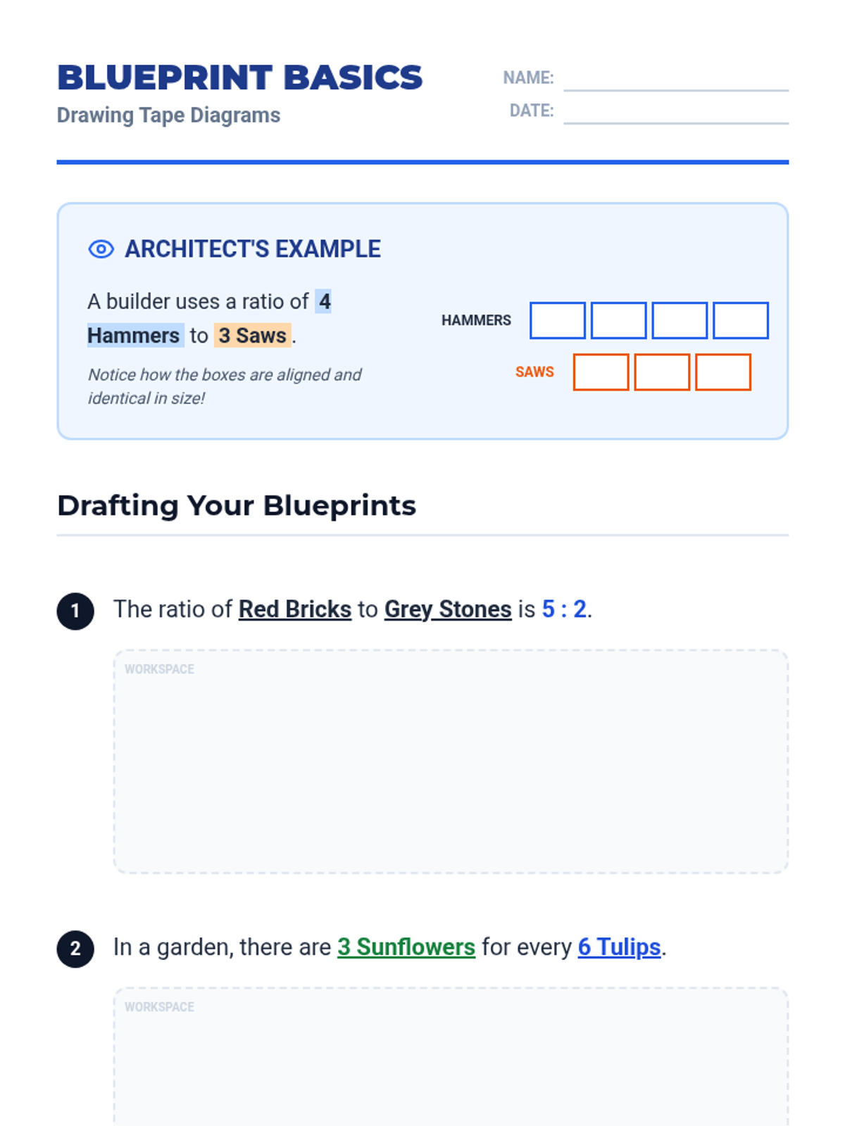 This sequence introduces the tape diagram (or bar model) as a primary tool for making abstract ratio and rate problems concrete. Students move from physical blocks to drawn models, focusing on reducing cognitive load and organizing information visually to solve multi-step ratio problems.