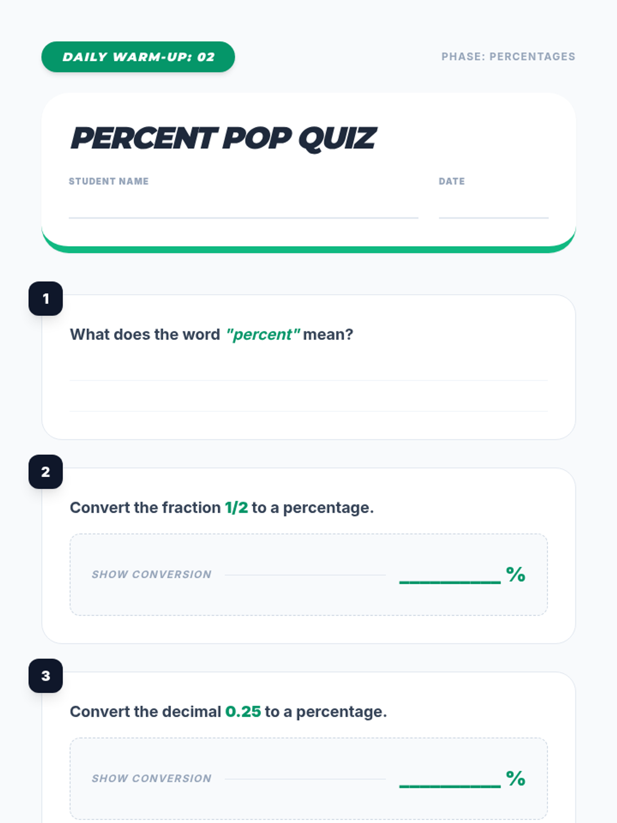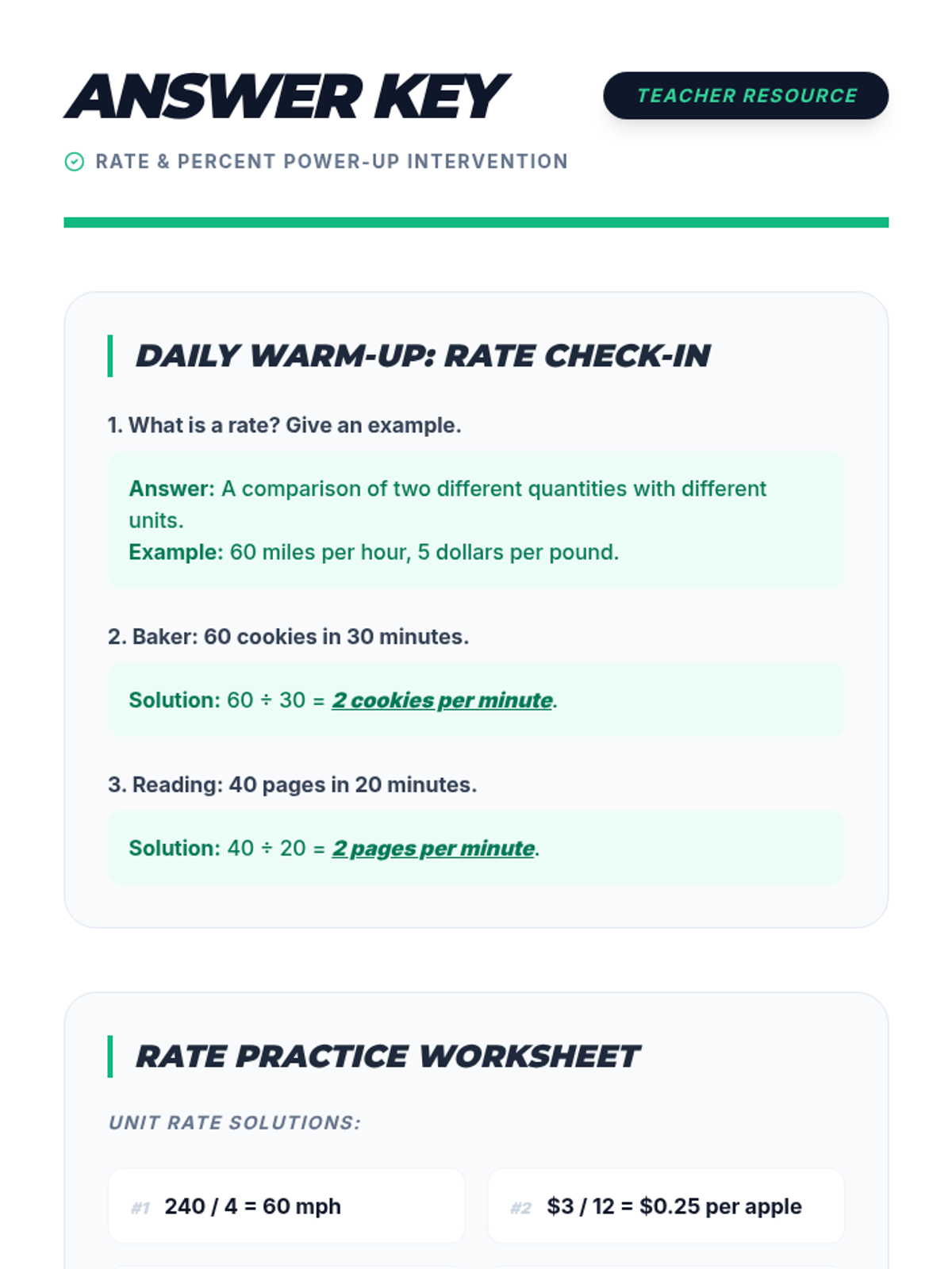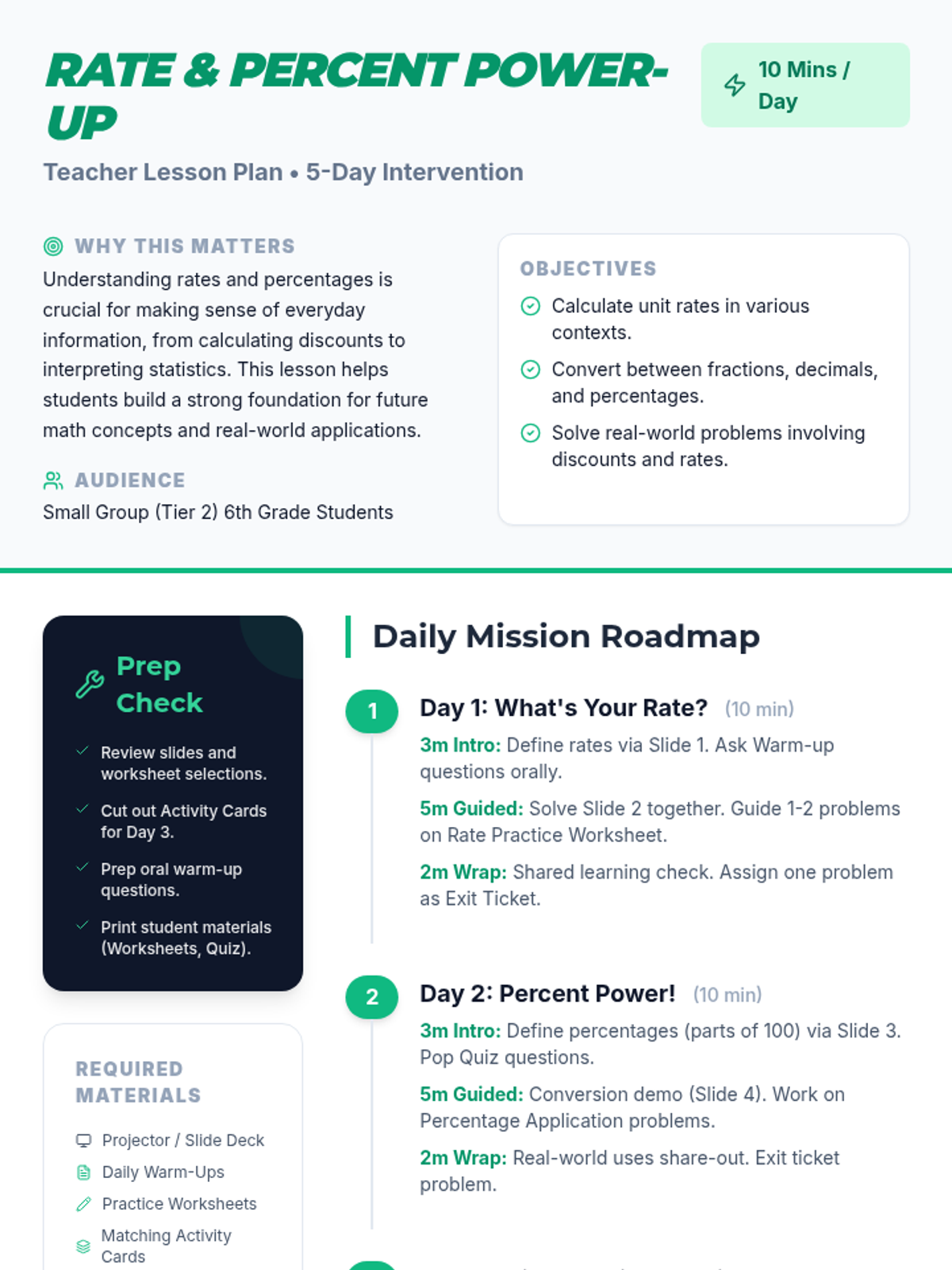 A 5-day intervention sequence for 6th-grade students to master foundational concepts of rates and percentages through daily 10-minute 'power-up' activities.