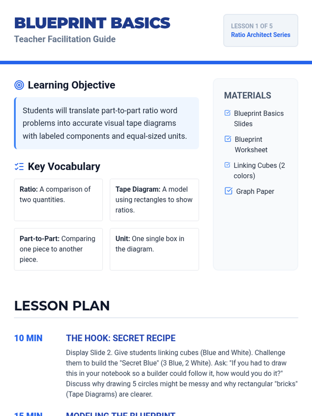 A comprehensive 12-lesson Tier 2 intervention sequence focused on 6th-grade ratio and proportion standards. Using High Leverage Concept strategies from the All Learners Network, this sequence moves from basic ratio language to complex unit rate and percent problems using visual models like tape diagrams and ratio tables.